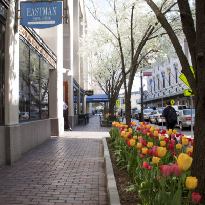 Miller Center is at the heart of much activity on Eastman’s Gibbs St. campus. The top three floors of the rectangular portion of the building house the Sibley Music Library (totaling 45,000 sq. ft.). The curved portion of the building houses four upper floors of office space, including Eastman’s Office of the Dean, and other administrative offices. The first floor holds restaurants and shops (including the Eastman School Bookstore), as well as the School’s Offices of Admissions, Registrar, Financial Aid, and Institute for Music Leadership. Miller Center’s spectacular atrium and outdoor public plaza provide gathering places for concerts, ceremonies, and informal meeting.