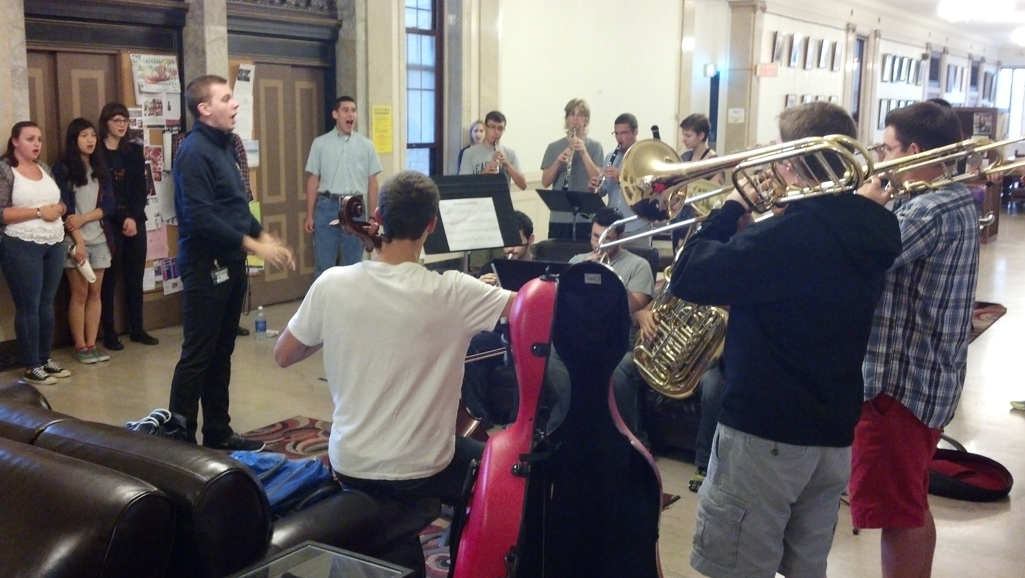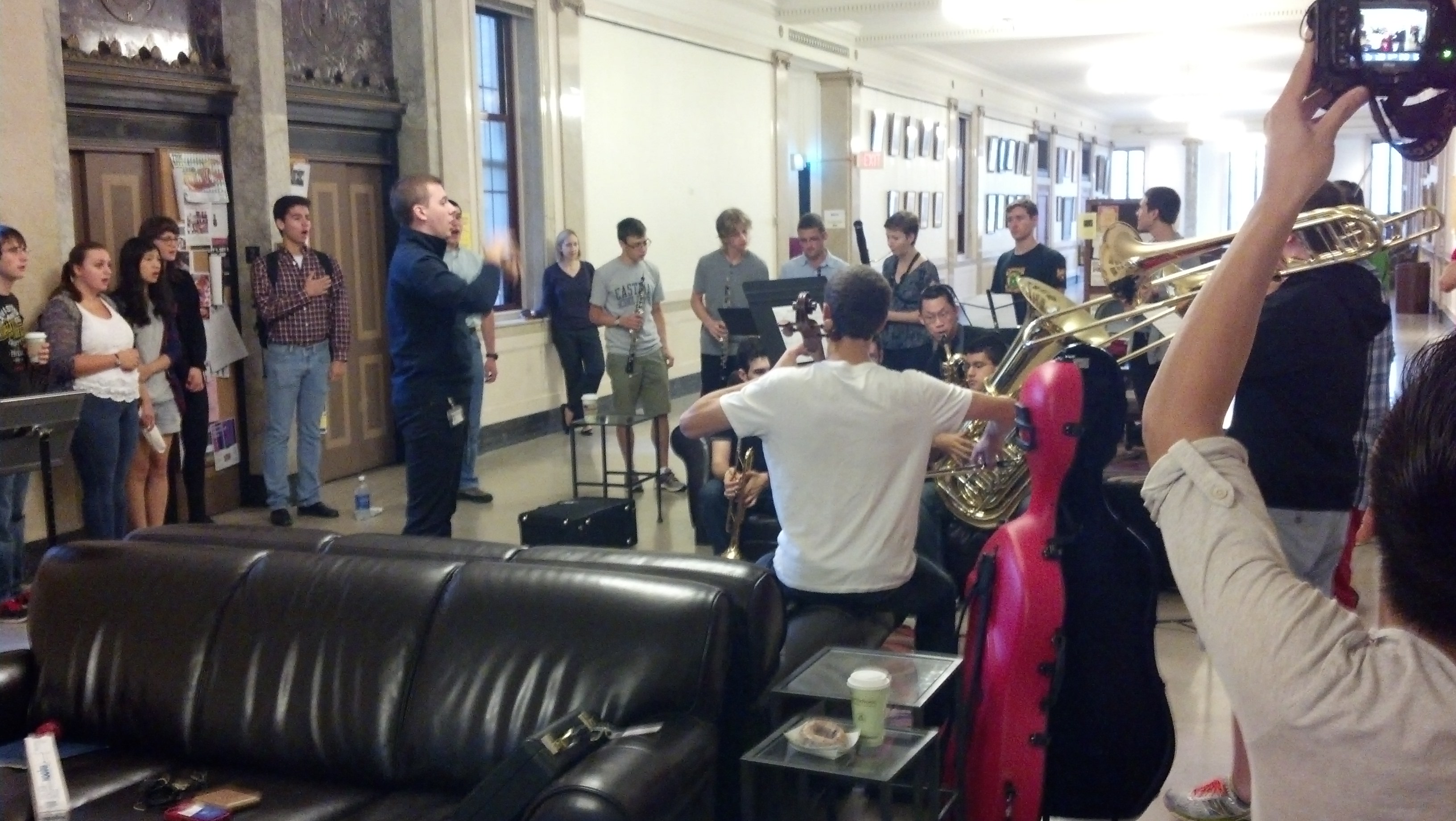 This year, a young freshman student from Croatia, Marco Pranic, had an idea; to play “The Star-Spangled Banner” in memory of the victims of the September 11th attacks. At 8:20 a.m. on this early Thursday morning, Eastman students, spurred by the efforts of Pranic, gathered in the Cominsky Promenade to do what they do best: play their instruments.