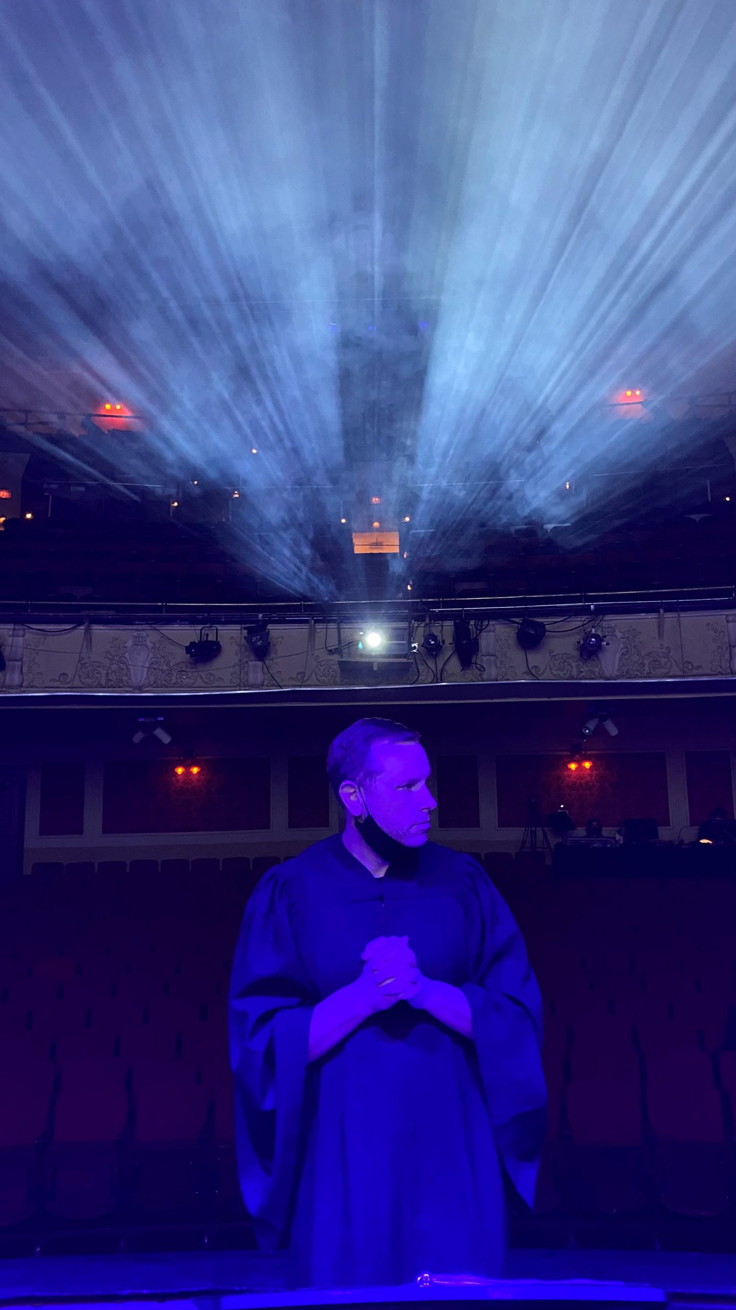 Dante 360, as the show was called, brought together visual imagery, commentary, spoken words, and drama to tell the story of the poet’s most enduring work, the Divina Commedia, or Divine Comedy. Under Anderson’s direction, Schola Antiqua outfitted Dante 360 with its own “soundtrack,” a wide-ranging musical program that took listeners on a sonic journey in the live cross-disciplinary undertaking, complete with local actors staging key scenes from the narrative, projected in another world with heavy use of theater fog. (See the photo below right .)