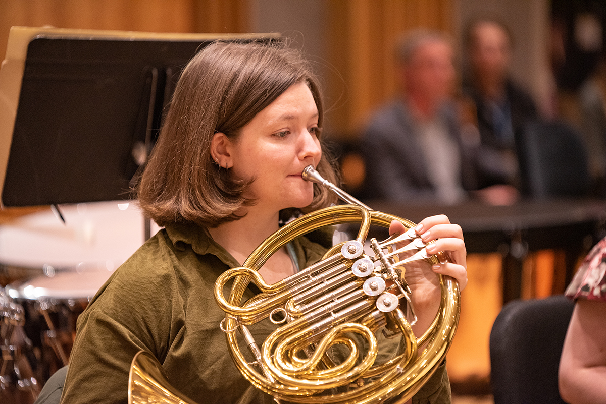 The Eastman Horn Choir was founded in 1968 by Verne Reynolds, Professor Emeritus of Horn at the Eastman School of Music, who served as its director until his retirement in 1995. From its inception, the Choir’s mission has been threefold: to provide an expanded ensemble experience for the horn students; to acquaint them (through transcriptions) of the breadth of quality repertoire (with a particular emphasis on the glorious vocal music of the German and Italian Renaissance) within our musical culture; and to encourage contemporary composers to create original works for multiple horns. In addition to compositions and commissions by such notable composers as Samuel Adler, Jeff Tyzik, John Cheetham, David Diamond, James Willey, Daniel Baldwin, Pamela Marshall, and Jennifer Bellor, the Choir’s repertoire in recent years has expanded to include transcriptions from the classical, romantic, and modern eras. Many of these transcriptions are the product of the creativity and entrepreneurship of current members and alumni of the horn studio.