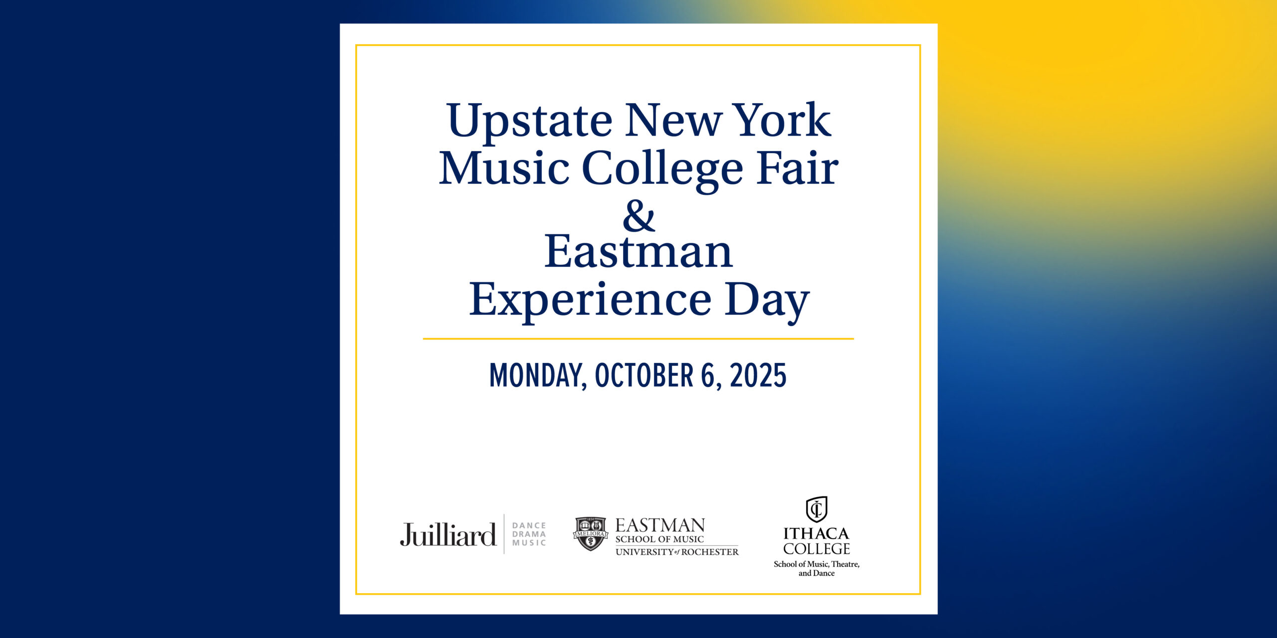 For the first time, the Eastman School of Music will host Eastman Experience Day and the Upstate New York Music College Fair on the same day, creating one of the most comprehensive music admissions experiences available for prospective students. On Monday, October 6, 2025, students are invited to Eastman’s campus to experience life as a music major through meetings with Eastman’s faculty and current students, access to ensemble rehearsals, and rapid-fire presentations by various academic departments. Attendees will also have the opportunity to learn about the music application process and connect with nearly 50 other music schools at the 18th Annual Upstate New York Music College Fair, co-hosted with The Juilliard School and Ithaca College School of Music, Theatre, and Dance. This full day of events is designed for high school sophomores, juniors, and seniors who are interested in music and the arts. Undergraduate students seeking information about graduate school options are invited to attend the College Fair.