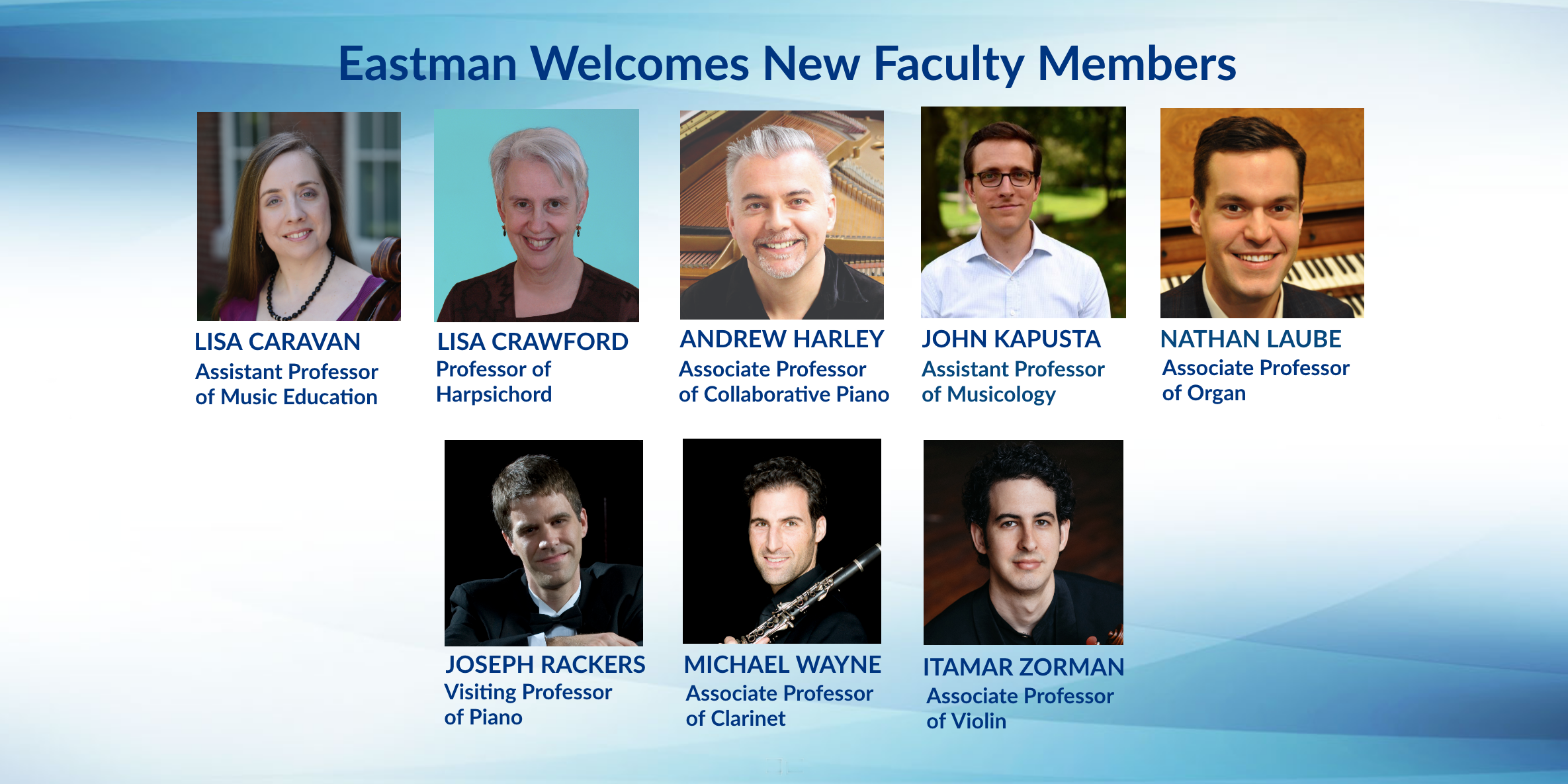 Eastman School of Music is proud to announce several new full-time and visiting faculty appointments for the 2019-2020 academic year: