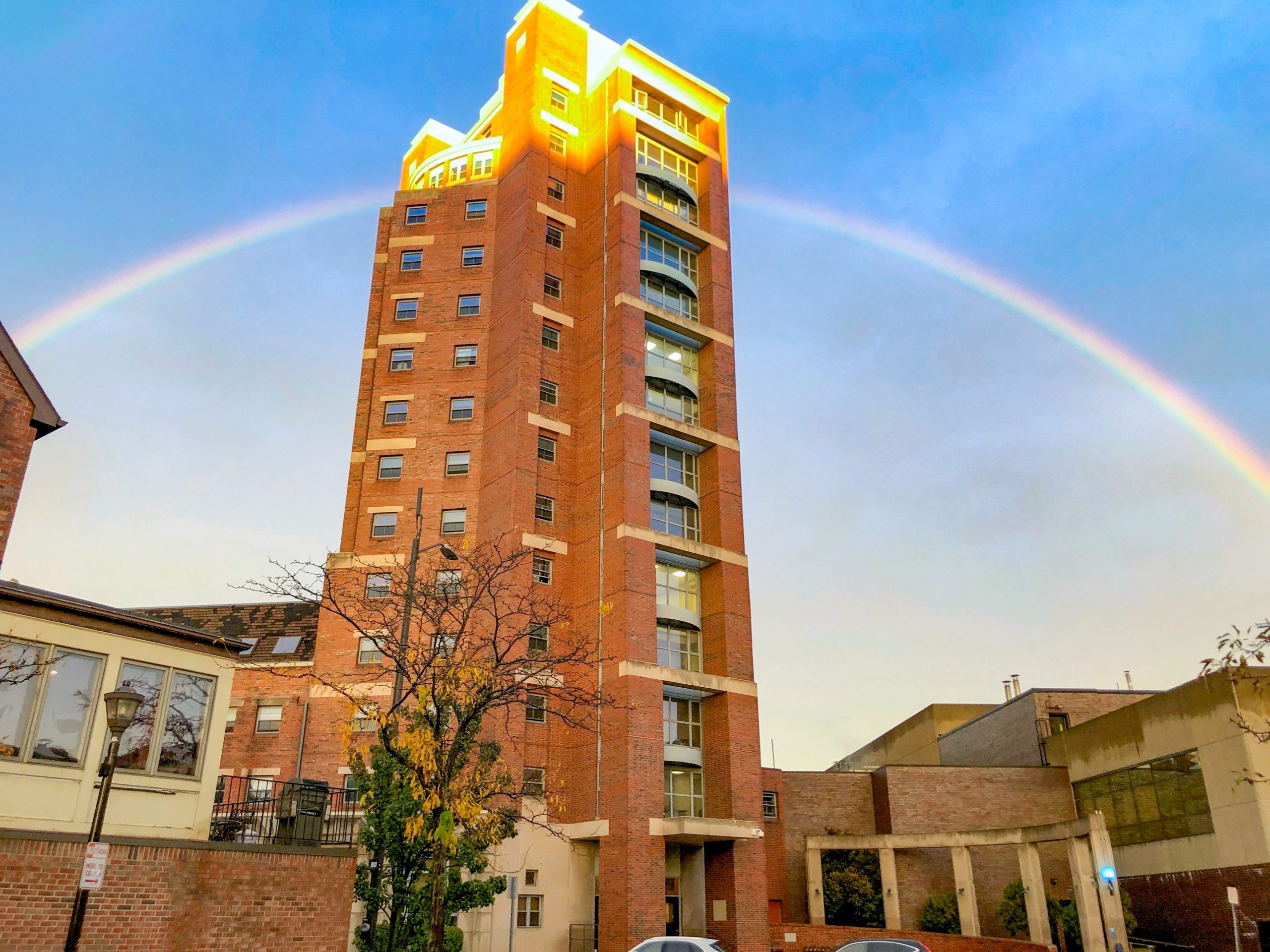 After a late-afternoon storm on October 22, a magnificent rainbow appeared in the sky over downtown Rochester. Greg Thompson of our Technology and Music Production Department caught it at a perfect moment over the Student Living Center.