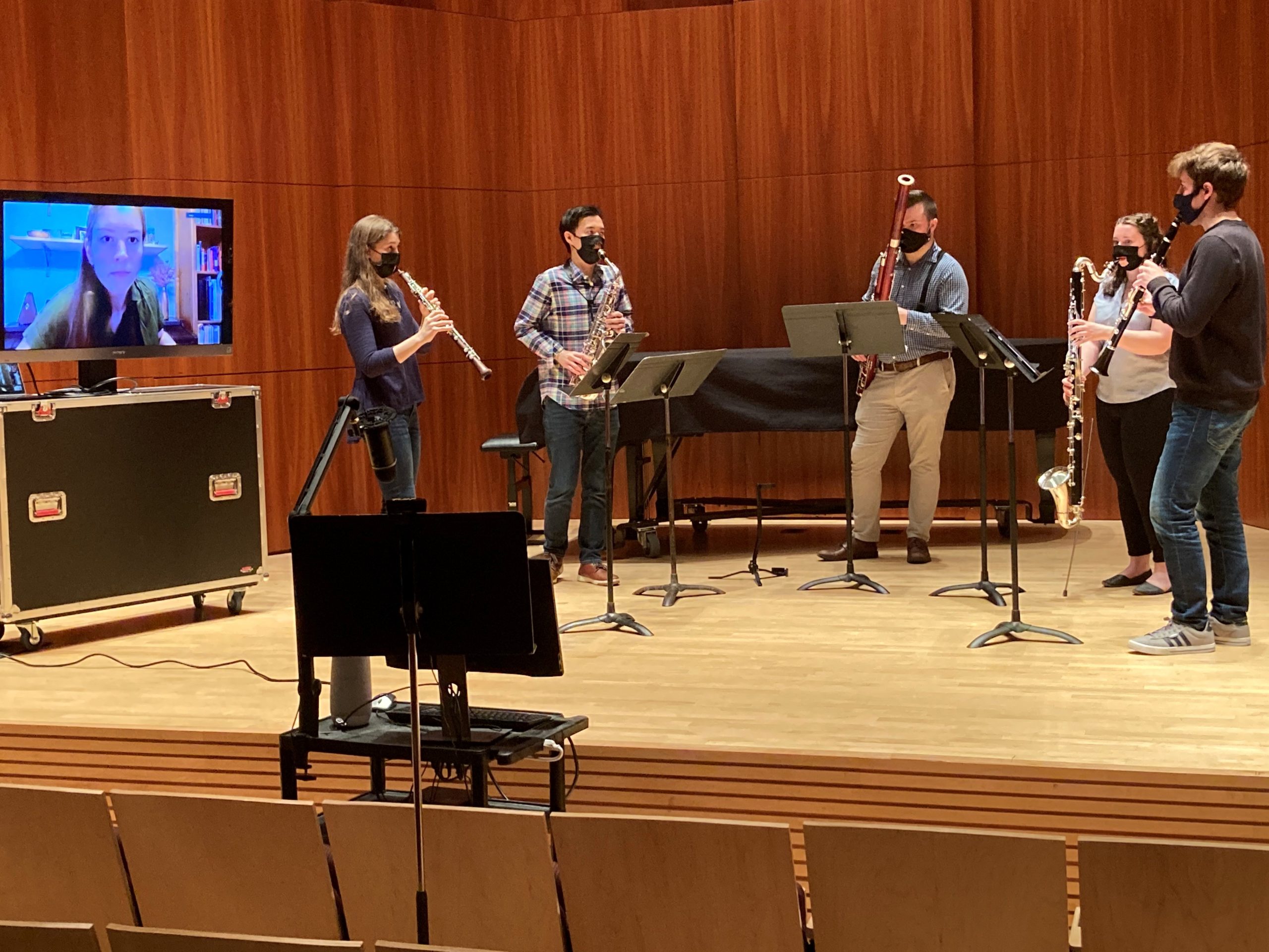 This spring included a virtual version of Eastman’s annual Clark Chamber Music residency. The Sequoia Reed Quintet is shown during a class in Hatch Hall. Photograph by Anne Harrow.