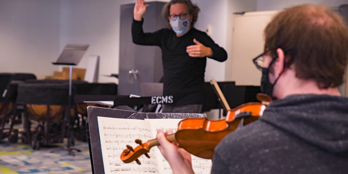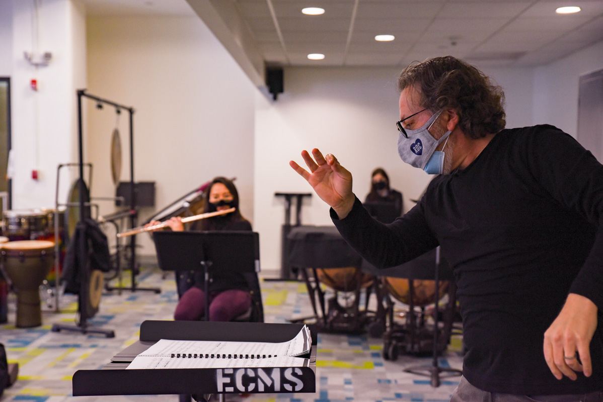 On Wednesday, April 28, Eastman Musica Nova will present a concert of music by four varied contemporary composers. As an introduction, Musica Nova director Brad Lubman offered some thoughts on his programming choices and concert planning during a year of unprecedented challenges. (Photographs of Brad and Musica Nova in rehearsal by Michelle Martorell)
