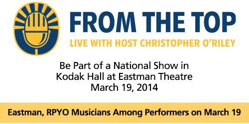 From the Top, the preeminent showcase for young musicians heard weekly on WXXI-FM 91.5, comes to Kodak Hall at Eastman Theatre to tape a radio broadcast on March 19 at 7 p.m.. The popular NPR program hosted by acclaimed pianist Christopher O’Riley will feature the amazing performances and captivating personal stories of extraordinary young classical musicians from across the country. This episode will be presented by WXXI and Eastman School of Music (ESM).
