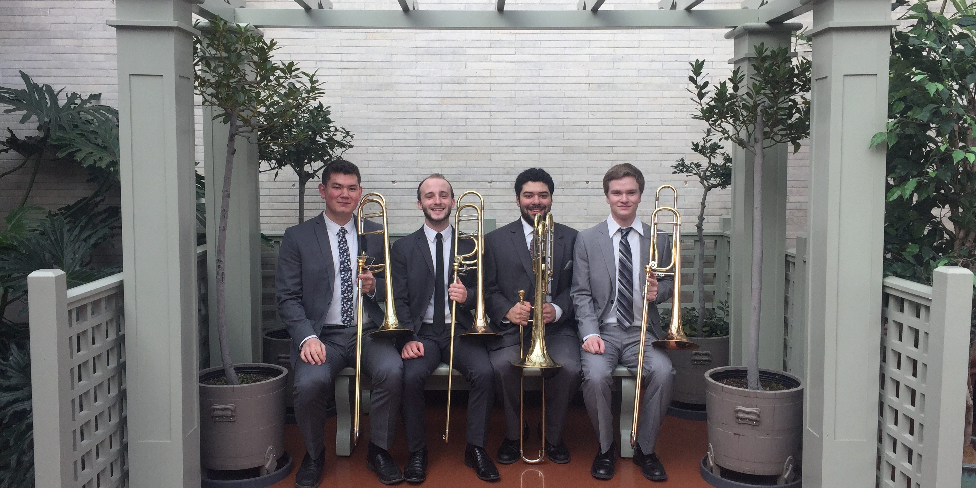 Four trombone students have been chosen to represent the Eastman School of Music in a concert at the John F. Kennedy Center for the Performing Arts on Saturday, March 31. The Amendous Quartet is made up of Ben Dettelback, Nick Crane, Jack Courtright, and Gabriel Ramos, all Bachelor’s of music students at Eastman.