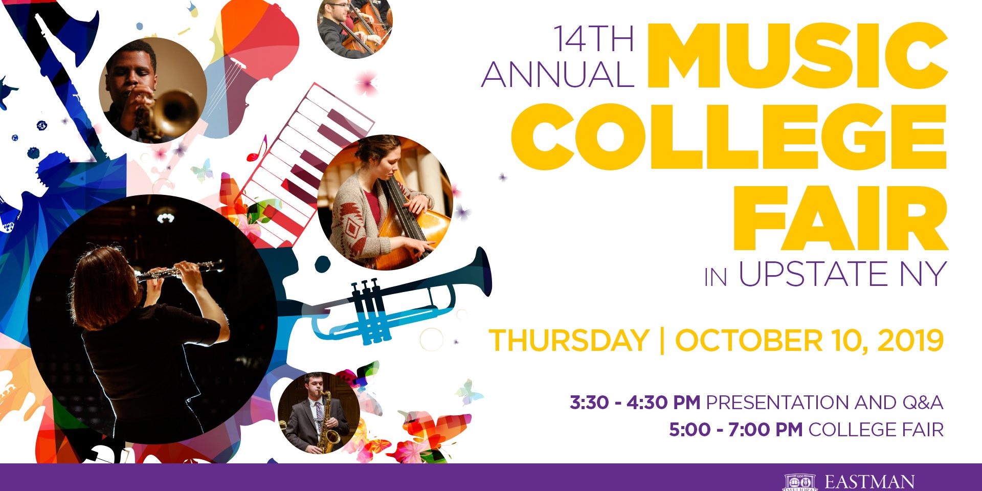 The Eastman School of Music, in collaboration with The Juilliard School and Ithaca College, presents the 14th Annual Music College Fair in Upstate New York at the Eastman School of Music on Thursday, October 10, from 5 to 7 p.m.