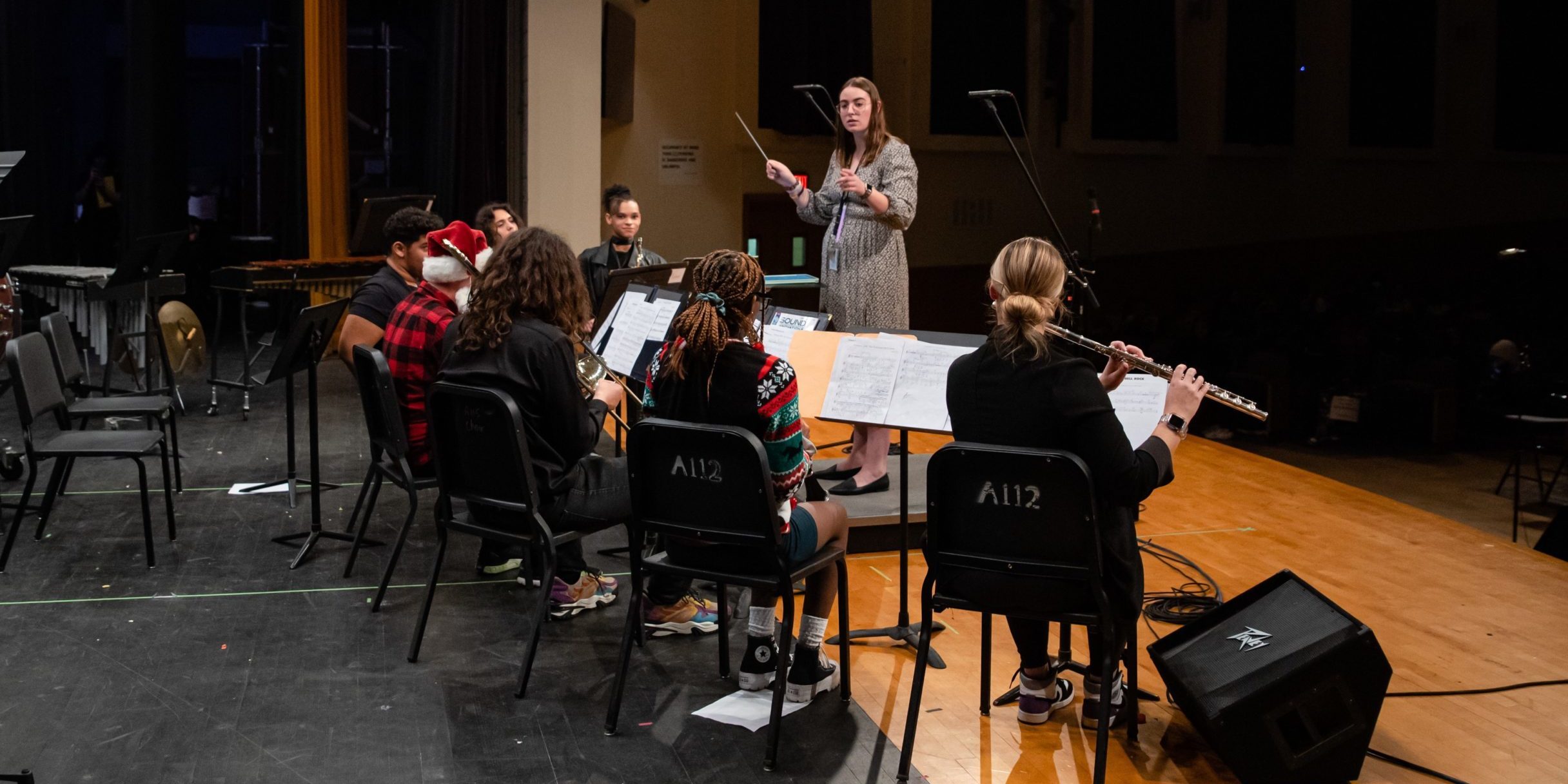 On Thursday, December 15, 2022, Rochester’s East High School Band (pictured above) premiered Freedom 2040: The Tomorrow We’ll Build, by Brittany J. Green. The piece, scored for both band and orchestra, was commissioned through support of the Paul R. Judy Center for Innovation and Research at the University of Rochester’s Eastman School of Music, along with additional support from Eastman’s Office of Academic Affairs. East High School’s current instrumental music teacher is Eastman alumna Hannah Wilson ‘22E. The following week, Rochester’s School of the Arts Intermediate Orchestra premiered the orchestral version of the piece. The orchestra’s director is another Eastman alumna, Elana Herman ‘06E, ‘12E (MM). “As educators, we are always seeking opportunities for students to identify and personalize experiences to heighten and enrich their education,” shares Herman. “As musicians and scholars, students working on this project were presented with the opportunity to diversify their experiences of classical music to culturally relevant contexts, all while working in a community of their peers towards rendering a common goal.”