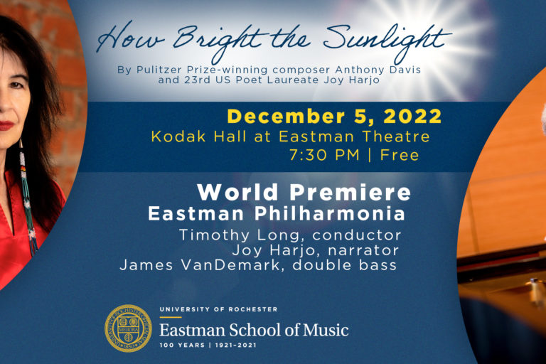 On December 5, 2022, the Eastman School of Music will present the world premiere of 2020 Pulitzer Prize-winning composer Anthony Davis’ How Bright the Sunlight, a work for symphony orchestra and narrator, with a libretto curated by the first Native American US Poet Laureate, Joy Harjo. The narration is based on both the Haudenosaunee Thanksgiving…