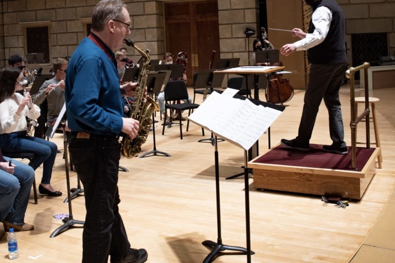 Story and photographs by Isabella Lau As rehearsals with the Eastman Wind Orchestra wrap up in preparation for their concert Wednesday, Mike Titlebaum (BM ’91, MM ’92) reflects on his career and connections between Eastman and Ithaca. He currently serves as Director of Jazz Studies at Ithaca College School of Music and holds two degrees…