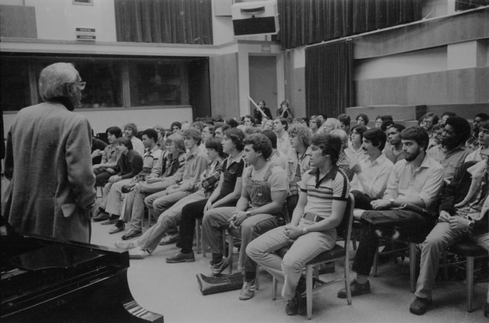 In the time-honored tradition of Eastman School alumni returning to their alma mater, pianist John Perry, ’56,’58 returned to Rochester in the fall of 1980 to give a recital in the Kilbourn Concert Series. In advance of his recital, on September 28th, Mr. Perry gave a master class in Howard Hanson Hall, coaching several Eastman piano majors before an audience that included his own Eastman School mentor, Mrs. Cécile Genhart.