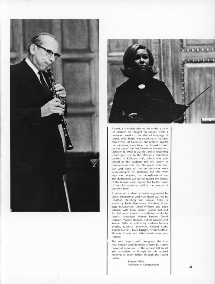On the day of the Moratorium to End the War in Vietnam, Eastman School students had expressed their convictions in a peaceable manner using the most powerful medium at their disposal: their art. They had conducted themselves honorably, and in so doing, had set an example.