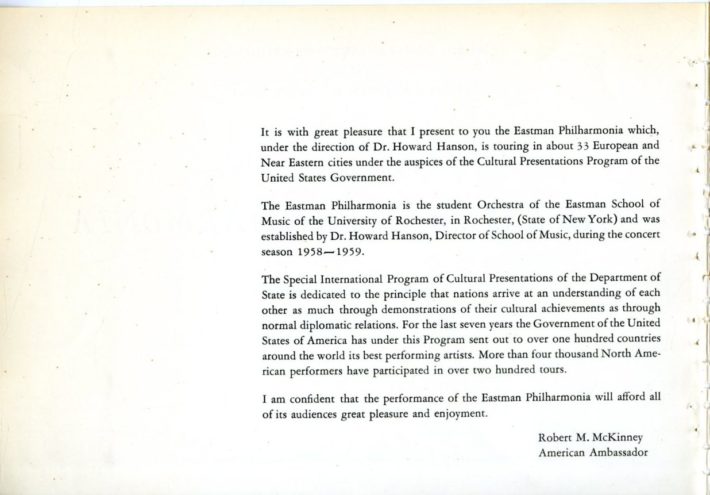 The Eastman Philharmonia’s 1961-62 tour happens to be one of the most well-documented undertakings in Eastman School history. Quite apart from the official documentation, the printed concert programs, the photographs, and various personal souvenirs that have been archived, the most complete account of the tour is in the hand of one Philharmonia member, bassoonist Richard Rodean, BM ’62, MM ’64, who kept a daily travel log throughout the tour. Besides providing essential details on travel and itinerary — especially important because the official printed itinerary that had been finalized before the tour was changed several times while the tour was in progress — Mr. Rodean’s travel log is suffused with a great deal of local color in observations about cities, concert venues, the details of life on tour and living out of a suitcase, becoming accustomed to local cuisine, experiencing wonder and awe at seeing some of the most famous sites in the world, and the gravity of the realization that the Philharmonia members were representing the United States and the Eastman School of Music in an undertaking of gigantic proportions. As “This Week at Eastman” continues to follow the Eastman Philharmonia, Mr. Rodean’s account of the tour will be a frequent companion.