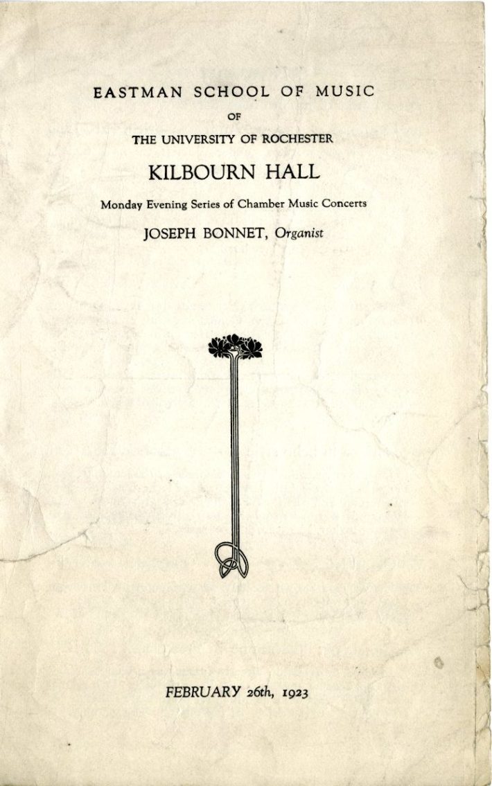 1 “The Season’s Music” in The Note Book, vol. 2, no. 1 (November 22, 1922), page 1. Printed copy shelved in the Sibley Music Library vault at Archives ML1 .E13n 1922-23; also accessible online . It is true that Rochester had had, since 1875, the opportunity to enjoy chamber music produced by the local group The Tuesday Musicale, but while The Tuesday Musicale’s programs were in every way respectable, they were not quite in the same league as the Eastman School’s new chamber music series. Activity of The Tuesday Musicale has previously been cited in “This Week at Eastman” and the Sibley Music Library holds a substantive collection of the group’s working papers; finding aid accessible here.