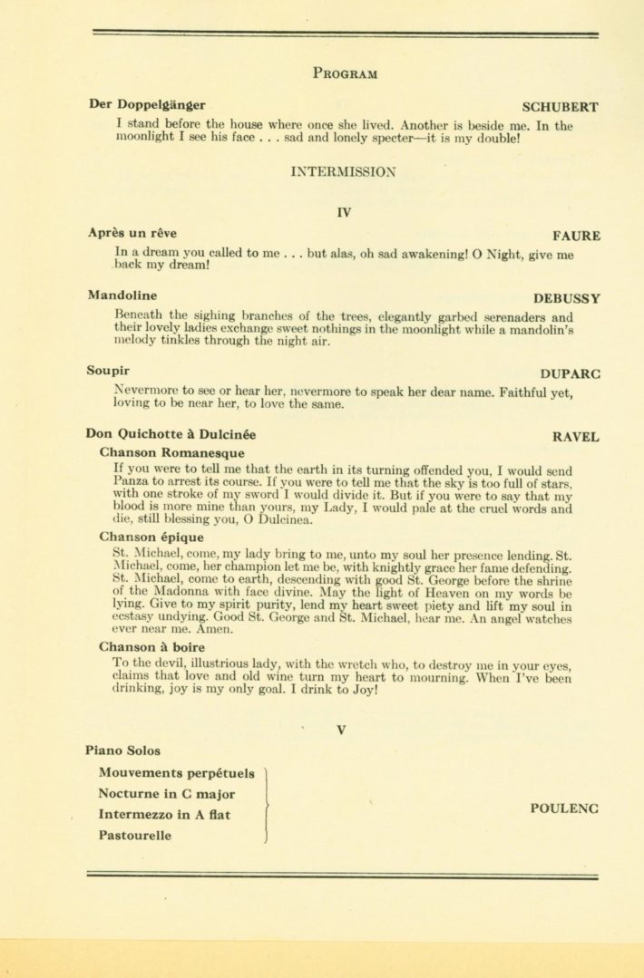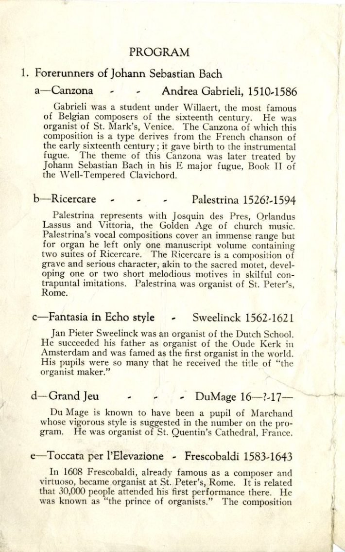 In the spring of 1922 the Eastman School’s Concert Bureau (as the Concert Office was initially called) launched an on-going series of Chamber Music Concerts, so named, with Kilbourn Hall as the venue; that new series would continue for several decades. In some seasons during the 1920s, ‘30s, and ‘40s there were actually two concurrent series of Chamber Music Concerts, e.g. a Monday evening series and a Tuesday evening series. While these concerts were a performing opportunity for Eastman faculty artists, they were most visibly and most significantly an opportunity for the school to present top-flight visiting artists of great renown. Under the auspices of the Chamber Music Concerts, Eastman audiences enjoyed the artistry of pianist Alfred Cortot, pianist Myra Hess, pianist Walter Gieseking, pianist Josef Lhevinne, harpsichordist Wanda Landowska, organist Joseph Bonnet, organist Louis Vierne, and various string quartets, including the London String Quartet, the Flonzaley Quartet, the Budapest String Quartet, and the Coolidge Quartet. Other artists who appeared in the Chamber Music Concerts included guitarist Andres Segovia, the Society of Ancient Instruments, the Aguilar Lute Quartet, the Trapp Family Singers, the American Ballad Singers (conducted by their founder, Elie Siegmeister), and lutenist Suzanne Bloch appearing in recital with harpsichordist Edith Weiss-Mann. Solo vocalists who appeared in the series included French baritone Pierre Bernac with his compatriot, composer-pianist Francis Poulenc, as his collaborative artist. Altogether, the Chamber Music Concerts brought a truly august procession of artists to Kilbourn Hall. Moreover, the cultural offering represented by the concerts was distinctly to the advantage of the wider Rochester community. As Eastman’s student newspaper The Note Book observed in 1922, at the start of the first chamber music season, the concerts afforded Rochester “a season of chamber music that Rochester has not known before.”1