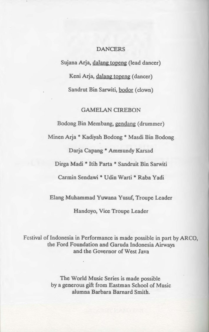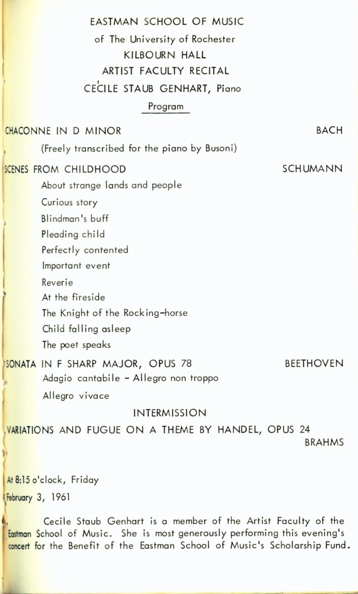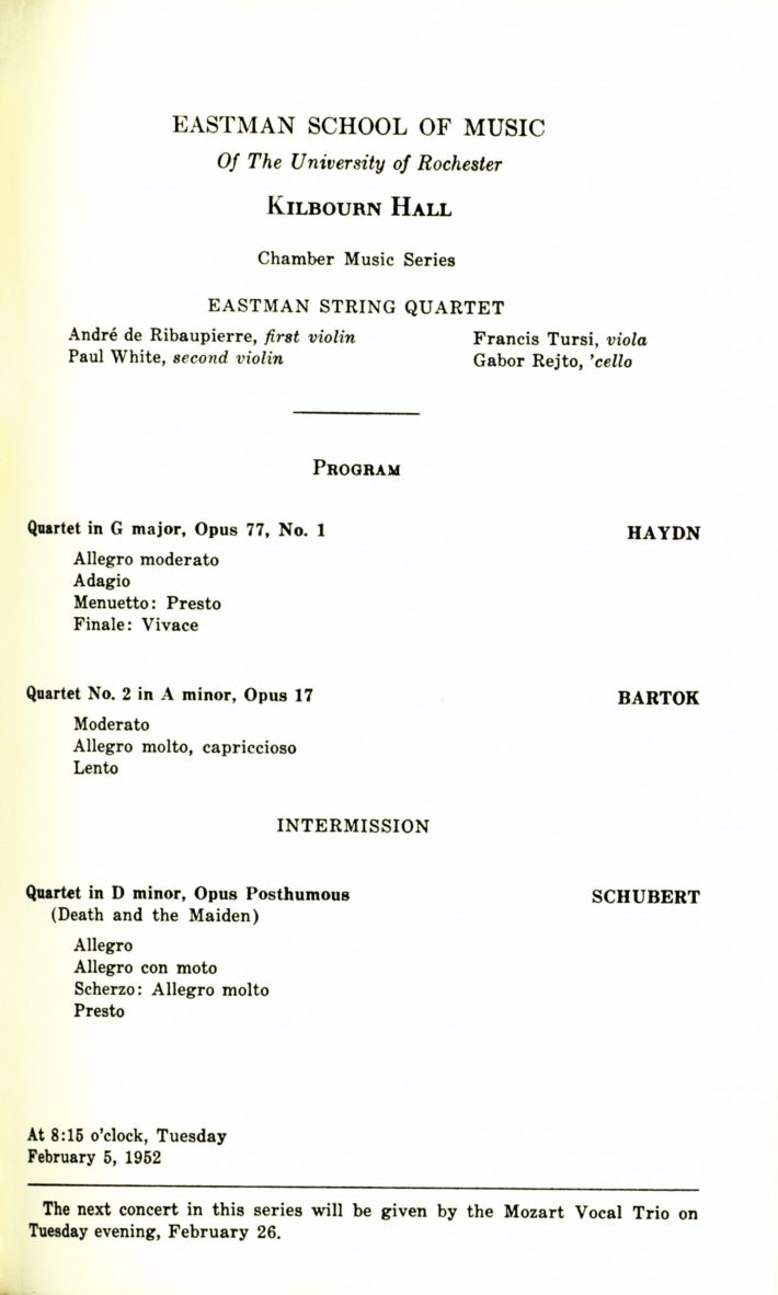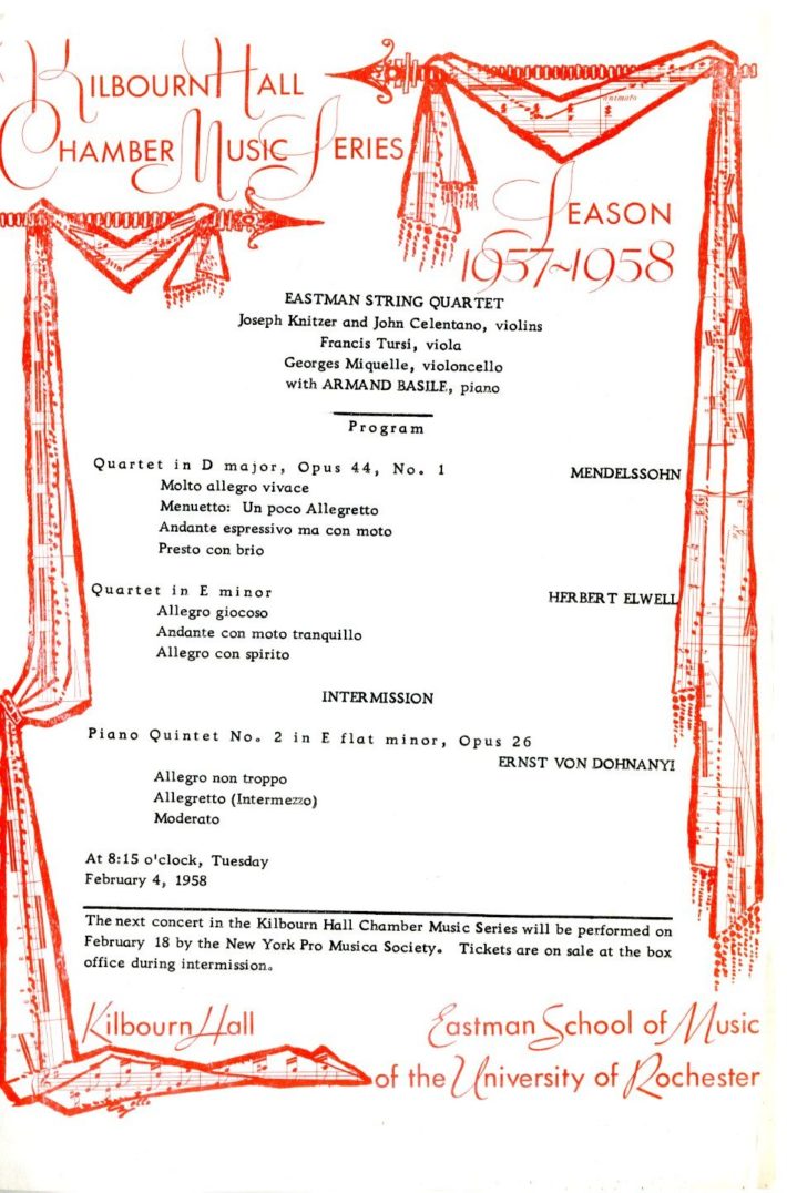 With the passage of time and owing to the vastly increased need of Kilbourn Hall for student programming as the Eastman School’s enrollment grew, the chamber music concert series was modified with respect to both frequency of programming and frequency of guest artist appearances. In 1957-58 the series rubric was changed to Kilbourn Hall Chamber Music Series, and for two seasons (1957-58 and 1958-59) the printed programs were printed and distributed on specially tinted stationery with ornamental styling and borders, as seen on the February 4, 1958 program of the Eastman String Quartet displayed here. In 1959-60 the Concert Office returned to the standard printed program format for this series. The Kilbourn Hall Chamber Music Series under that name did not continue after 1966-67, and in time, the Concert Office founded new recital series such as we enjoy today.