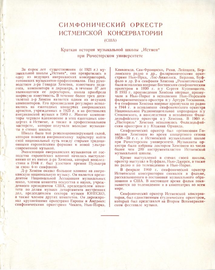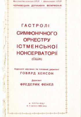 Sixty years ago this week, the members of the Eastman Philharmonia were continuing their landmark three-month tour with performances in the USSR.  After performing concerts in Moscow in the last week of January, the orchestra members journeyed south to the Moldavian Soviet Socialist Republic and the Ukrainian Soviet Socialist Republic for concerts in Odessa, Kishinev (today Chişinӑu), Chernovtsi (today Chernivtsi), Lvov (today Lviv), and Kiev (today Kyiv).  Given that they were now travelling in the USSR’s principal agricultural region, their sightseeing itinerary included a visit to a collective farm outside of Chernovtsi.  Bassoonist Richard Rodean described in his travel journal the choreographed manner of the visit, which included being greeted by the farm’s managers and local Community Party officials, and sitting for a question-and-answer session with one of the managers.  The official insistence on making as favorable an impression as possible was also reflected in a tourist brochure found among Howard Hanson’s papers, displayed here. The color brochure, printed by Intourist (the USSR’s state-run tourist agency for visitors from abroad), is a vintage item of Cold War-era tourism, as it presents a sunny and attractive view of the region in which the Philharmonia members were now travelling, ignoring altogether the grim living conditions of many of the inhabitants.
