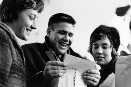►Throughout the tour, receiving letters from home was a welcome thing for members of the Philharmonia. Most of their mail was delivered via diplomatic pouch. These two photos capture the delight experienced by the travellers when reading news from back home. Eastman School Photo Archive.