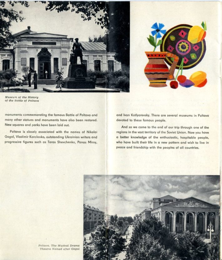 Sixty years ago this week, the members of the Eastman Philharmonia were continuing their landmark three-month tour with performances in the USSR. After performing concerts in Moscow in the last week of January, the orchestra members journeyed south to the Moldavian Soviet Socialist Republic and the Ukrainian Soviet Socialist Republic for concerts in Odessa, Kishinev (today Chişinӑu), Chernovtsi (today Chernivtsi), Lvov (today Lviv), and Kiev (today Kyiv). Given that they were now travelling in the USSR’s principal agricultural region, their sightseeing itinerary included a visit to a collective farm outside of Chernovtsi. Bassoonist Richard Rodean described in his travel journal the choreographed manner of the visit, which included being greeted by the farm’s managers and local Community Party officials, and sitting for a question-and-answer session with one of the managers. The official insistence on making as favorable an impression as possible was also reflected in a tourist brochure found among Howard Hanson’s papers, displayed here. The color brochure, printed by Intourist (the USSR’s state-run tourist agency for visitors from abroad), is a vintage item of Cold War-era tourism, as it presents a sunny and attractive view of the region in which the Philharmonia members were now travelling, ignoring altogether the grim living conditions of many of the inhabitants.