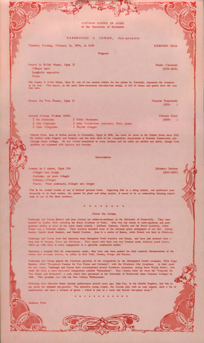 In this week’s “Weekly Dozen” we recognize an interesting Graduation Concert with Orchestra that featured four vocalists all performing Russian opera (most likely due to the influence of Russian-born Nicholas Konraty on the Voice Department faculty); distinguished guest artists in voice and duo piano; a performance of a dramatic legend; celebrations of the lives of two men — one a conductor and arranger, the other a composer and author — who made singular contributions to life in and around the Eastman School; and some superlative student performances such as grace the Eastman concert calendar each week of the semester.
