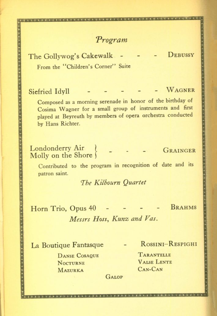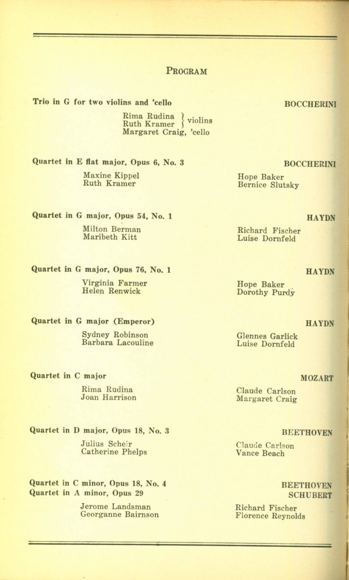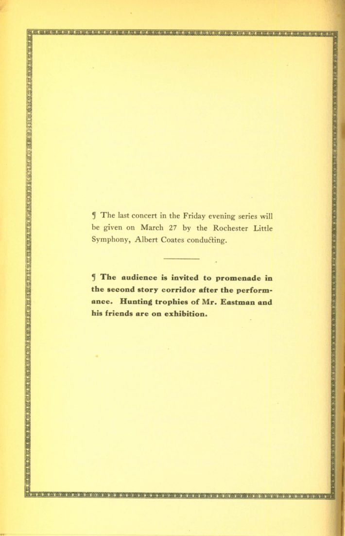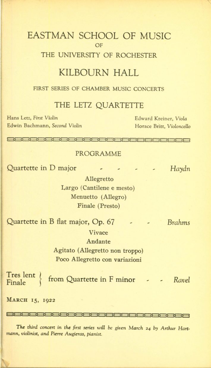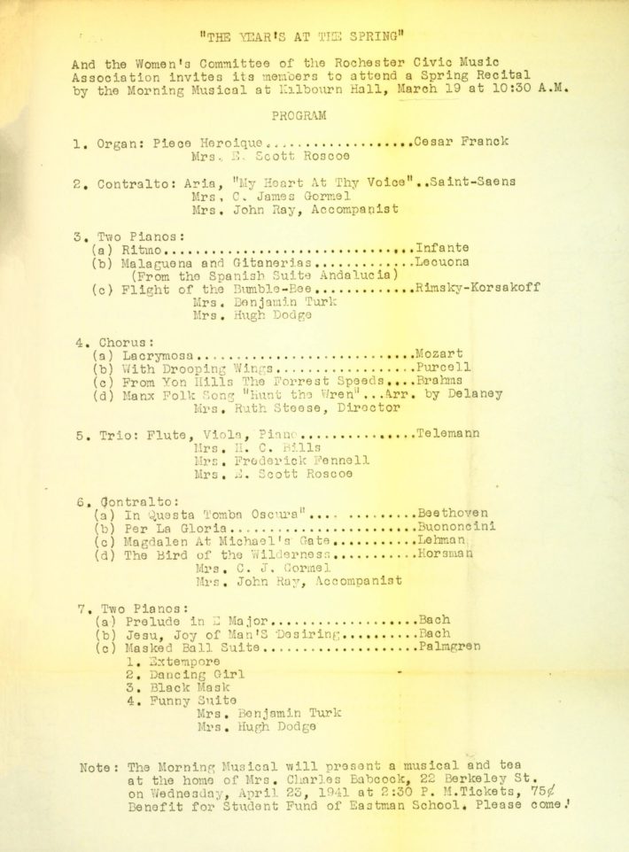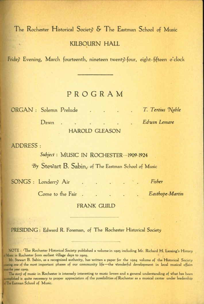 In this week’s Weekly Dozen, we recognize the special concert that was performed in memory of the late George Eastman in 1932; a performance by distinguished visiting artist Andres Segovia; a members’ recital of the local musical group The Tuesday Musicale which did much to organize musical activity in Rochester across one half-century; a recital by one of the Eastman School’s distinguished resident string quartets; a Kilbourn Hall recital by two truly distinguished artists, bass Julius Huehn and conductor Erich Leinsdorf, on this occasion finding service as a pianist; and some superlative student performances such as grace the Eastman concert calendar each week of the semester.