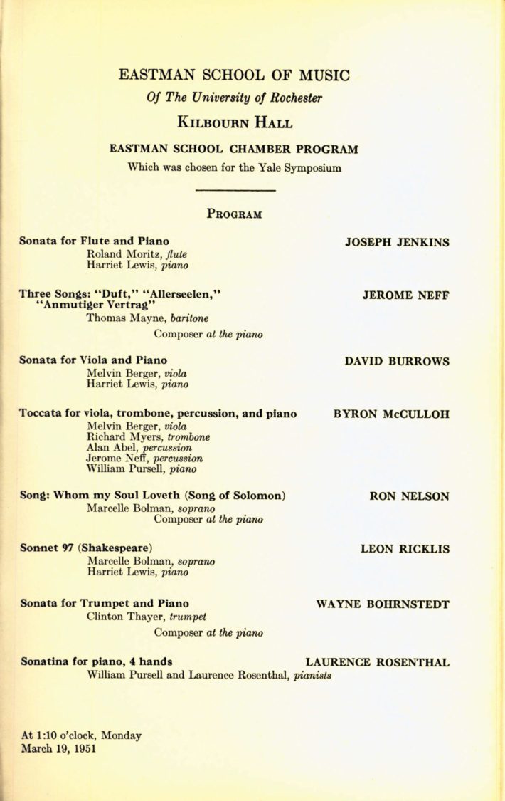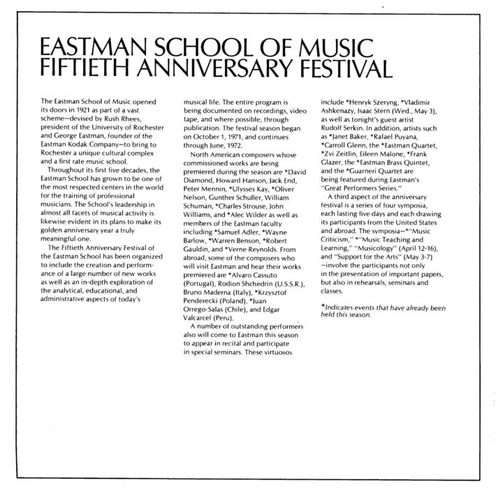 Just as now, during our on-going Centennial celebration, the Fiftieth Anniversary Festival was an extended celebration when the Eastman School pulled out the proverbial stops to showcase the school’s many strengths and to reflect upon the numerous contributions made by the Eastman School to the larger musical world. The 1971-72 year included the gala re-opening in January, 1972 of the Eastman Theater (with live simulcast via WXXI-TV) following several months of extensive renovations. The Festival also included the four above-mentioned Fiftieth Anniversary Concerts and also a Great Performers Series that featured other distinguished guest artists and Eastman School faculty members in recital. There were also four large Symposia throughout the academic year, one Symposium lasting five days and drawing an international body of attendees, and each one examining and discussing issues of relevance in the modern musical world, namely, music criticism, music education, musicology, and [support of the arts]; each of the four Symposia drew an international body of attendance. Previously in “This Week at Eastman” I’ve mentioned (in the week of February 7th/13th) the Symposium on music education, at which the distinguished presenters included Shinichi Suzuki. (That Symposium happened to be named the Symposium on Music Teaching and Learning, which might be said to have presciently foreshadowed the future name change of the Eastman School’s Department of Music Education.) And finally, there were the premiere performances in fulfillment of the commissions of new works; altogether, the Eastman School had commissioned a total of 23 new musical works. The premiere performances created showcase opportunities for Eastman School ensembles, at times involving collaboration with distinguished guest soloists. In short, the Fiftieth Anniversary Festival was not to be missed.