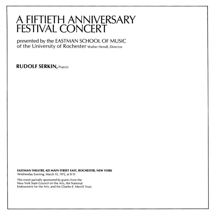 Fifty years ago this week, beloved concert pianist Rudolf Serkin made a guest appearance at the Eastman School that included a Kilbourn Hall master class and an Eastman Theater solo recital. Mr. Serkin’s appearance was the third of the designated Fiftieth Anniversary Concerts, a sequence of four guest appearances by internationally renowned artists during the Eastman School’s 1971-72 Fiftieth Anniversary Festival. (Altogether, those four artists were Henryk Szering, Vladimir Ashkenazy, Mr. Serkin, and Isaac Stern; each man’s Eastman appearance included both master class and recital.) At the time of his Eastman School visit, Mr. Serkin was nearing age 69, and in that very same month, he marked his 100th appearance with the New York Philharmonic Orchestra by performing the Brahms First Concerto with the orchestra.