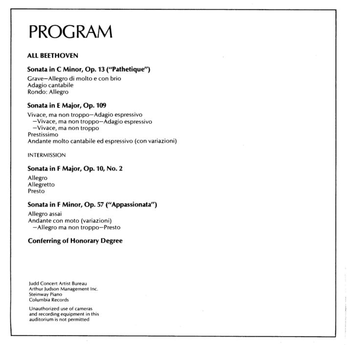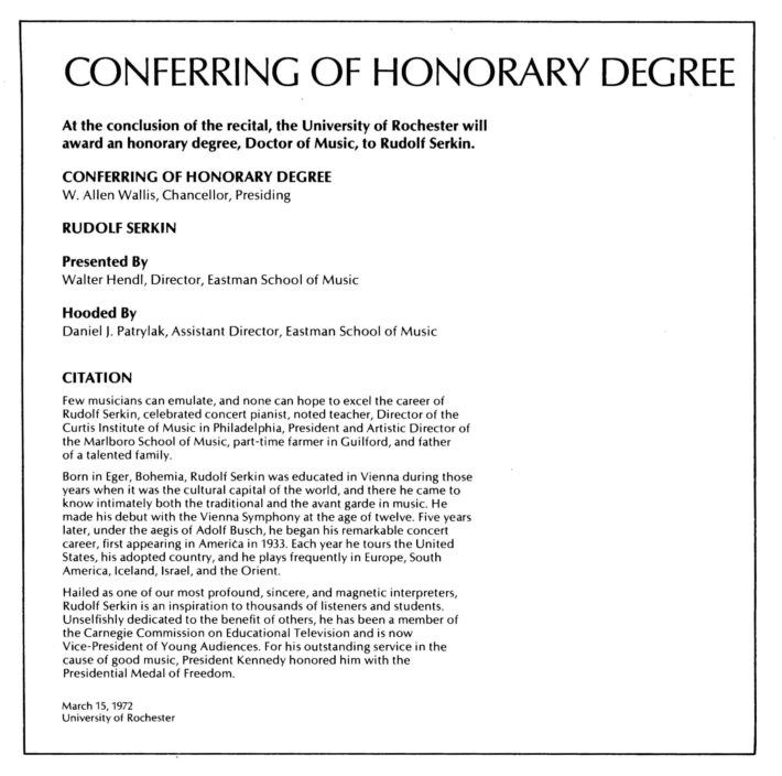 Mr. Serkin’s Eastman recital was an all-Beethoven program, comprised of four Sonatas: the Pathétique in C minor, opus 13; the Sonata in E major, opus 109, one of the five last Sonatas; the Sonata no. 2 in F major from opus 10; and the stormy Appassionata in F minor, opus 57. (! You can interact with a first edition of the opus 57 at the Sibley Music Library’s Ruth T. Watanabe Special Collections.) The choice of Beethoven was entirely in character for Mr. Serkin, who was widely regarded as one of the 20th century’s foremost interpreters of Beethoven. At the conclusion of the recital, Mr. Serkin graciously accepted an honorary Doctor of Music degree from the University of Rochester. UR President W. Allen Wallis presided over the short ceremony, at which Eastman School Director Walter Hendl presented the degree and read the citation, and Assistant Director Daniel Patrylak, BM ’54, MM ’60, hooded the newly designated Dr. Serkin. The citation which Mr. Hendl read to the audience is worth quoting here in its entirety: