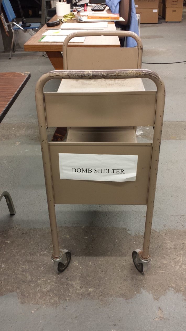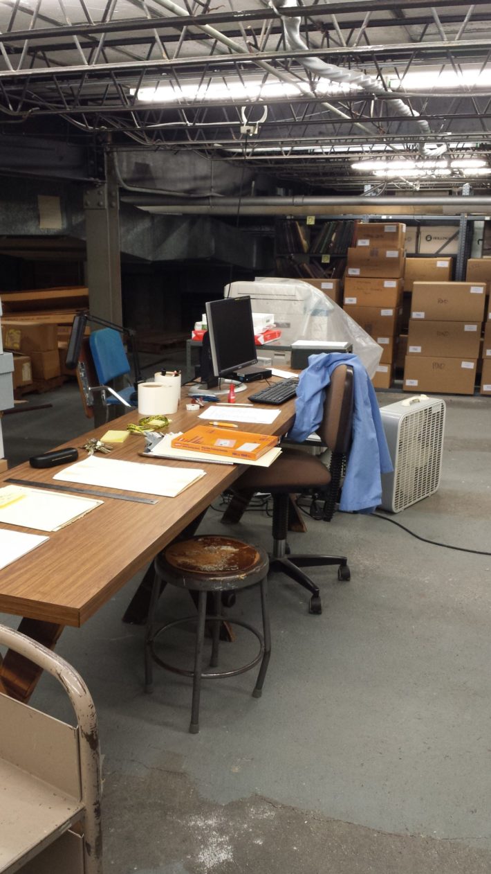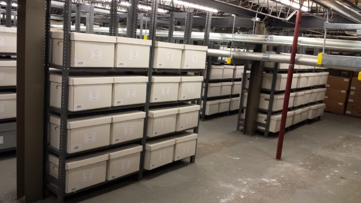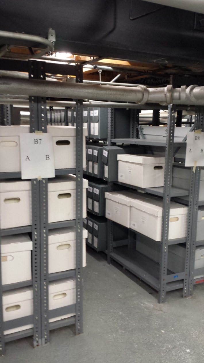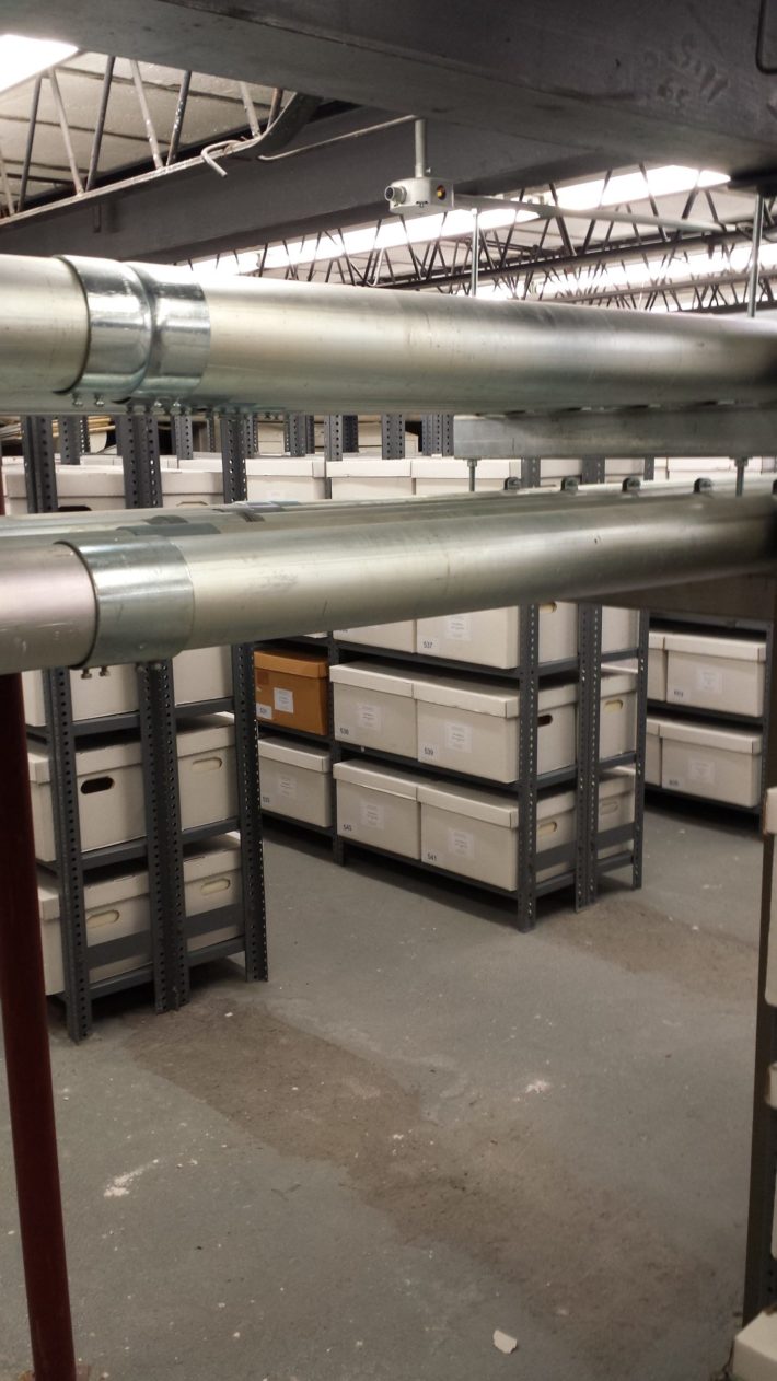 Following processing of the collection (carried out in the summers of 2003-06), white Hollinger boxes line the rows of shelving. The presence of low-hanging pipes and conduits represented something to be watchful of on a daily basis, hence hard hats were initially issued to the team.