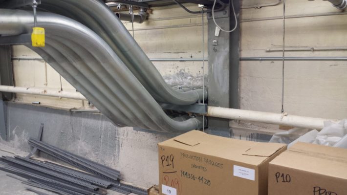 On two occasions, circumstances external to the Sibley Music Library impacted the Archive’s shelving configuration in the basement space. On each occasion, we were obliged to re-consider how to use the space efficiently while guaranteeing the safety of, and ease of access to, the Archive. The first was in the summer of 2004 when, as part of extensive renovations to the Eastman Theater, massive conduits were to be installed in the basement. By design, the planned conduits would run the entire length of the basement interior through its very center, i.e. directly through the heart of the shelving area. Installation would thus entail the removal of a significant linear footage of shelving, effectively dividing the space into two distinct areas on either side of the new installation. Faced with a decrease in shelf space, I opted to devote the basement’s shelf space entirely to three of the four record sub-groups—the last copies, the historical papers, and the new accessions, and to stage the production packages away from the shelving area in an unshelved but stable arrangement.