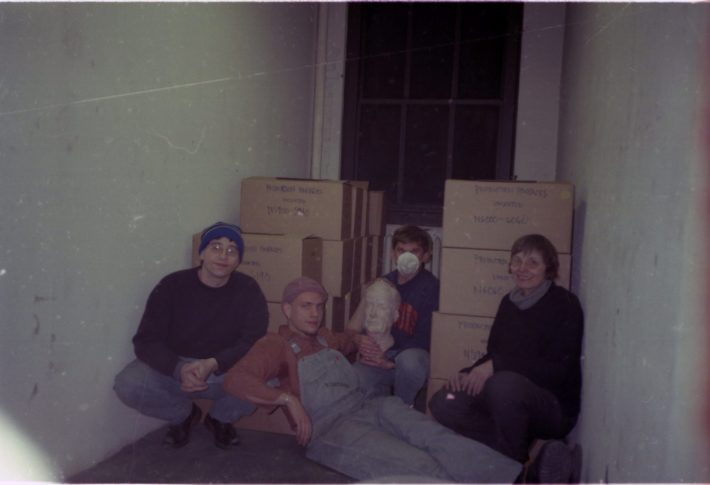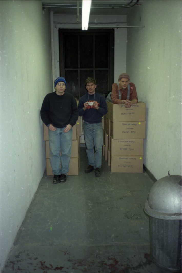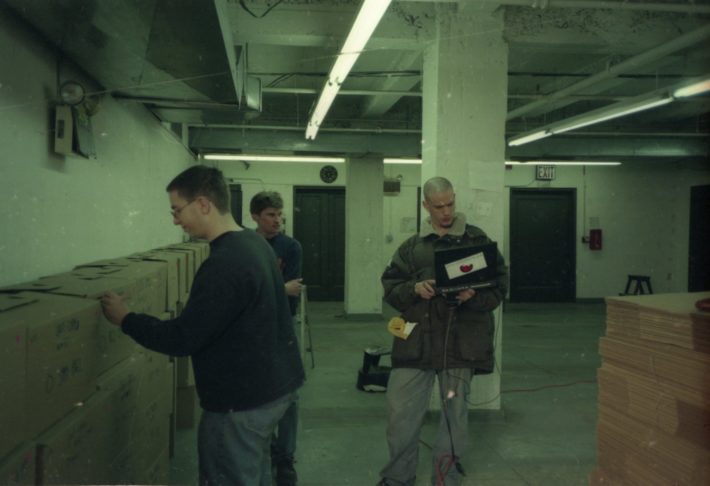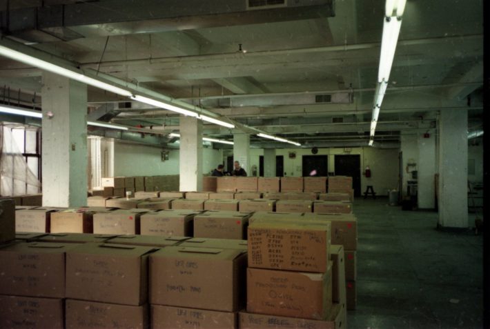 Nearing the end of their week’s work, team members Brodsky, Coppen and Quinn are seen among the lines of shipping crates that they have filled and have lined up in sequence in the space that had previously housed Carl Ficher’s Rental Library. The shipping crates (some 400 in all) would be trucked to Rochester in the following week.