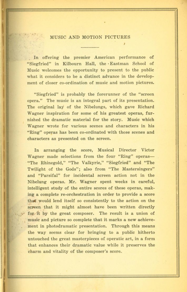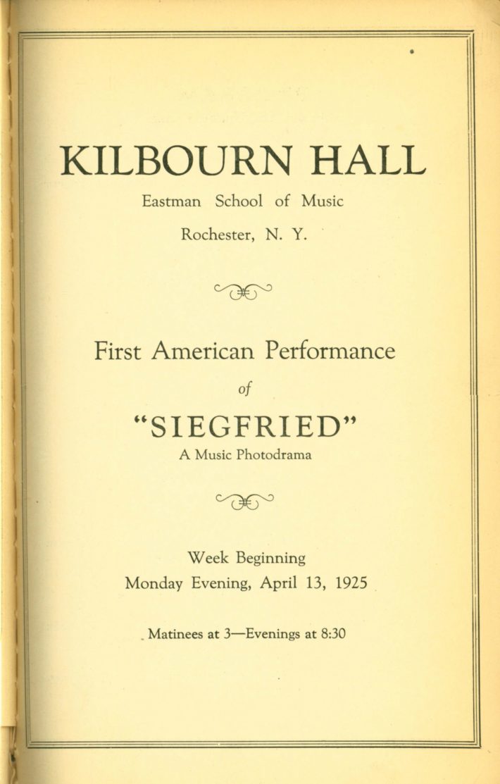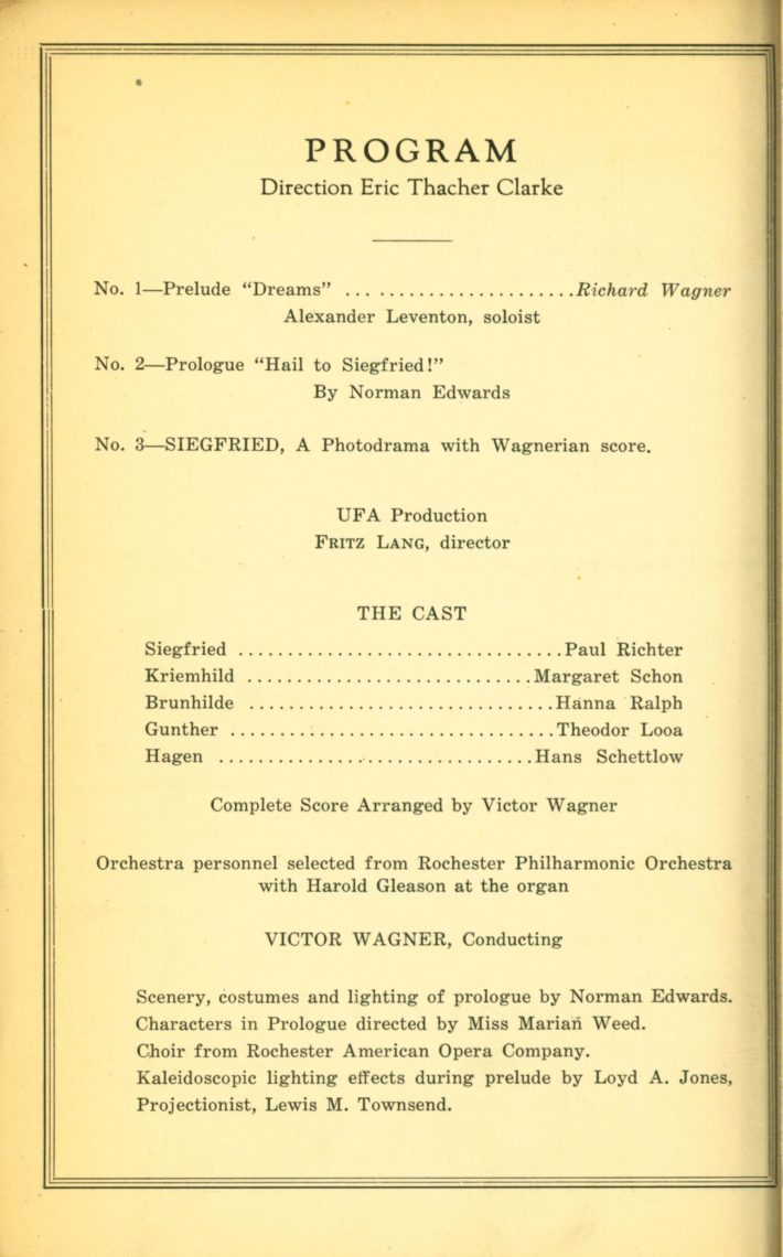 In this week’s “Weekly Dozen” we recognize two illustrious choral showcases, performance by members of that never-dull Rochester American Opera Company, a photo-musical Siegfried event that shines the spotlight on the 1920s film activity around the Eastman School, and as always, some superlative student performances such as grace the Eastman concert calendar each week of the semester.