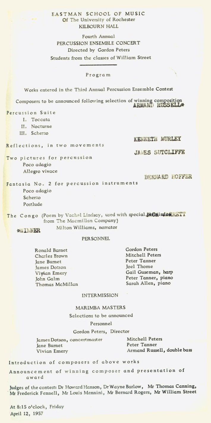 At the very same Festival, in a concert on April 11th, the Eastman School Symphony Band had performed Mr. End’s twelve-minute work Floor Show under Frederick Fennell’s direction, a work that the same ensemble had introduced at a concert in May, 1943. Arguably, that work was more in line with the “concert music” rubric than the works performed on April 16th. In any event, there would be no more explicit mention of jazz at an Eastman School Festival of American Music until 1962.[5] Two years after that, Hanson retired and the Eastman School was passed to a new administration under which the wheels would inexorably turn, with the eventual founding of the department of Jazz Studies and Contemporary Media in 1970. Nevertheless, the 1946 performance had taken place; the master tapes and the various printed documents are extant to substantiate it. A first public performance of jazz at the Eastman School of Music was on record.