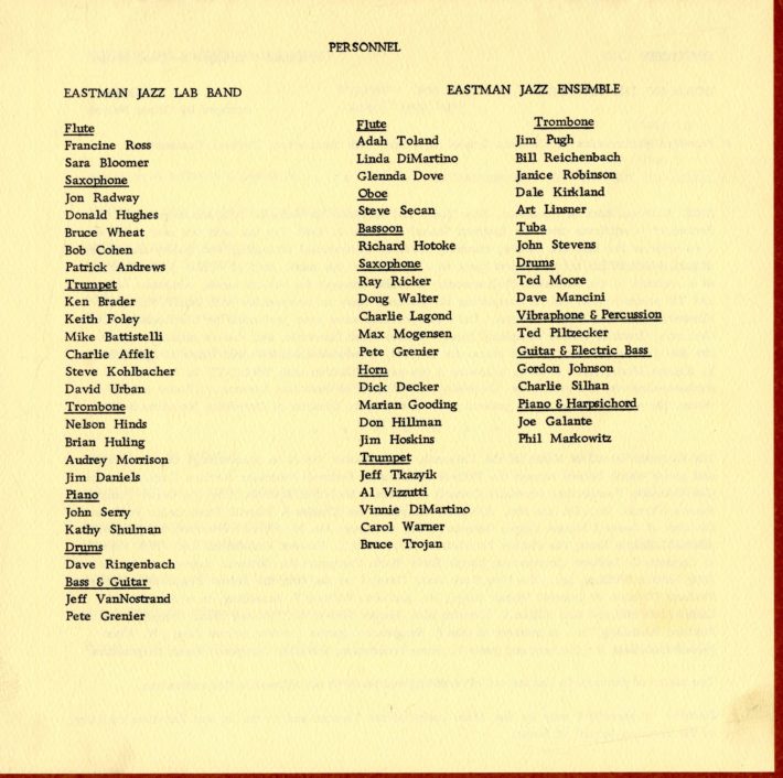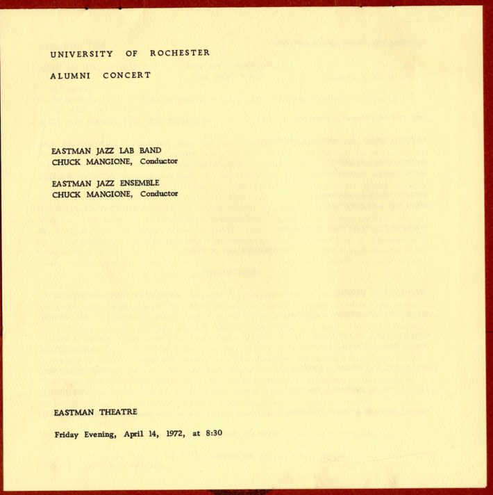 Finally, it should be acknowledged that the two concerts on April 14th and 15th, 1972 were Chuck Mangione’s valedictory appearances as Director of the Eastman Jazz Ensemble. Mr. Mangione had not renewed his faculty contract past the 1971-72 academic year; he has gone on record regarding the circumstances of that time. His four years at the helm of the Eastman Jazz Ensemble had been years of tremendous achievement for the EJE, which will be acknowledged in later “This Week at Eastman” entries.