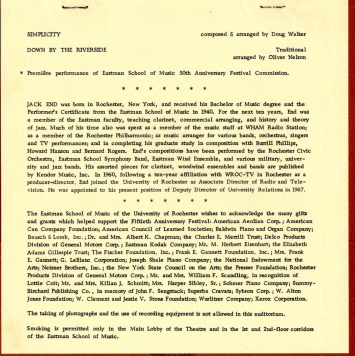 In 1971, the Administration of the Eastman School of Music selected 23 composers from whom the ESM would commission new works for the school’s fiftieth anniversary; Jack End, BM ’40 was among them. Further, Mr. End’s composition would be one of two jazz commissions for the 50th anniversary, the other being a new work by Oliver Nelson, which would be premiered by the Eastman Jazz Ensemble in March, 1972. In Mr. End’s case, the 50th anniversary commission represented an appropriate professional recognition of the man who had earned the right to be known as the Eastman School’s pioneer in jazz. In that decade (1940-50) when Mr. End had been a young faculty member coaching, teaching, and directing Eastman students, the Eastman School’s administrative recognition of jazz in the school’s curriculum was still some time away in the future.