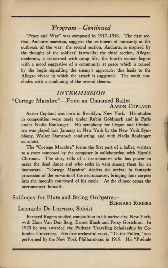 Inevitably, of the seven composers featured in the May 1st, 1925 concert, the uncontested winner in the popularity department is Aaron Copland (1900-1990), who for some time enjoyed the nickname “dean of American composers” and who became a respected mentor to composers at Tanglewood and whose works in all genres became standard repertory. The performance of Mr. Copland’s Cortège macabre was a world premiere from a planned but never realized ballet Grohg.[6] Following the May, 1925 American Composers’ Concert, Mr. Copland would make several more visits to the Eastman School and to Rochester, with later visits in (but not limited to) 1964, 1974, 1976, and 1979.
