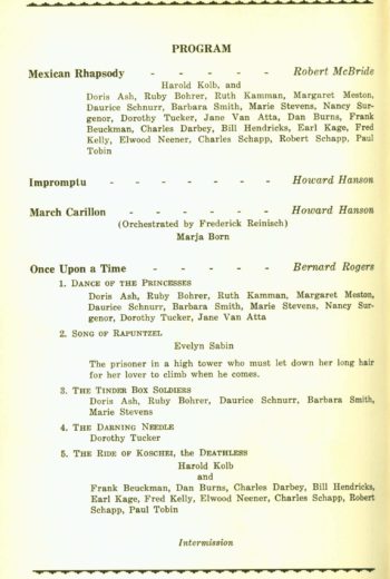 In this week’s “Weekly Dozen” we recognize a program of American music sponsored by the Eastman School’s Alpha Nu chapter of the Phi Mu Alpha fraternity (signifying that Eastman students were climbing aboard Howard Hanson’s American music bandwagon); a ballet performance from the years when dance was regularly performed in the Eastman Theater; a rousing program of marches conducted by Frederick Fennell, but this time performed by the Eastman Philharmonia and not the Eastman Wind Ensemble; a world premiere by Eastman Opera Theater of an Eastman student composer’s opera; and finally, some superlative student performances such as grace the Eastman concert calendar each week of the semester.