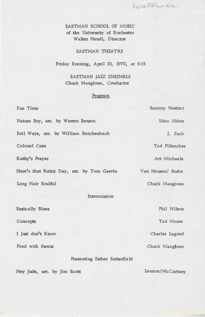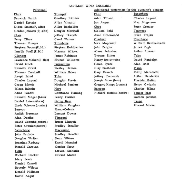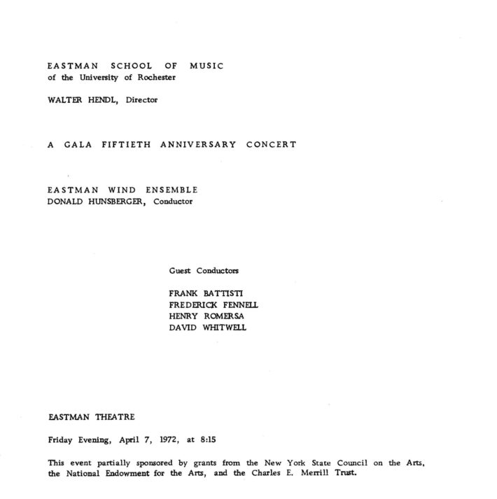 The concert was given in combination with a joint meeting in Rochester of the Eastern Division of the College Band Directors National Association (CBDNA) and the Third National Wind Ensemble Conference. The National Wind Ensemble Conference had been inaugurated in 1970 to serve as a national forum for the continuing discussion of the wind ensemble concept while providing a gathering place for conductors, composers, and performers. At each of the annual conferences, exposure was given to a specific aspect of the repertory being performed on a regular basis by leading wind ensembles around the nation. At the 1972 conference, there were two concerts (one in Kilbourn Hall and the other in the Eastman Theater) to focus on music for the orchestra wind section and the chamber wind ensemble, and on the piano concerto with wind accompaniment. The conference’s performance highlight was the April 7th concert in the Eastman Theater that brought guest conductors David Whitwell, Frederick Fennell, Henry Romersa, and Frank Battisti to the podium.