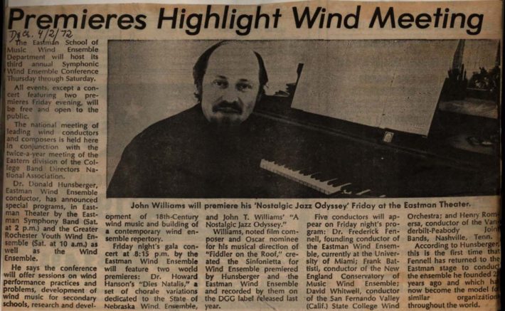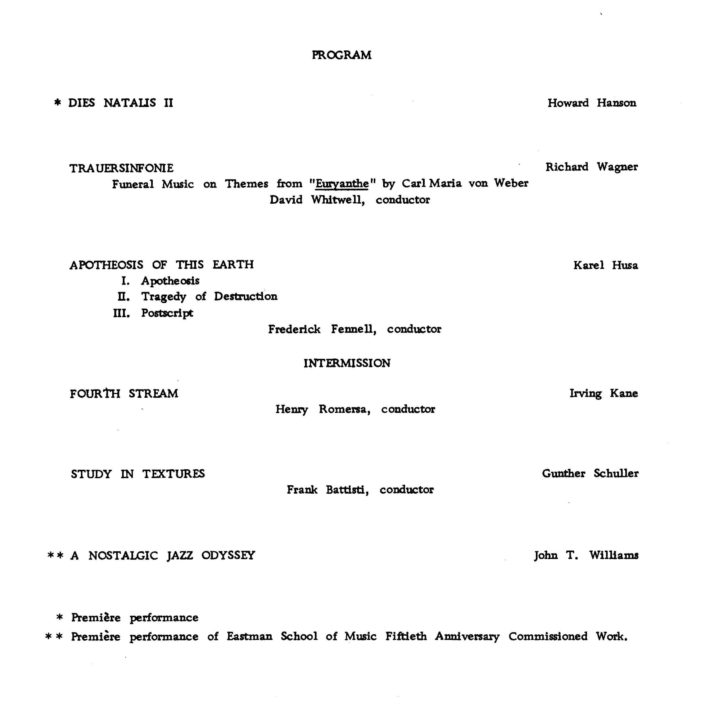 The other work premiered by the EWE that evening had been a special commission for the Eastman School’s 50th anniversary. John T. Williams (b 1932) was at that time a composer and conductor enjoying a reputation for his work in film and television. In his early years in Hollywood he had performed in film scores by such composers as Elmer Bernstein, Leonard Bernstein, Jerry Goldsmith, and Henry Mancini; throughout the 1960s he had composed for several television series; he had received his first Academy Award nomination for his score for Valley of the Dolls (1967); had received a second nomination for his score for Goodbye, Mr. Chips (1969); and then had won his first Academy Award for his score adaptation for the feature film Fiddler on the Roof (1971). In the spring of 1969 the Eastman Wind Ensemble had twice performed his Sinfonietta, and then had recorded the work for Deutsche Grammophon the following year. In 1971 the Eastman School commissioned a new work from him specifically for the EWE. The result was A Nostalgic Jazz Odyssey, a 17-minute work whose “nostalgic” associations are explained by the composer in the program notes (the printed program displayed here). As it happened, Mr. Williams was unable to attend the April 7th premiere performance owing to his contractual obligations elsewhere with film work. He would enjoy further film successes in the 1970s, and in 1977 his score for George Lucas’ feature film Stars Wars—for which he would also conduct the score with the London Symphony Orchestra—would send his already healthy reputation into the proverbial stratosphere.