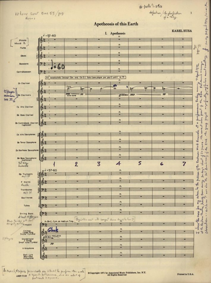 The April 7th, 1972 concert also marked Frederick Fennell’s first return engagement at the Eastman School since his resignation from the ESM faculty in 1962. For the concert he chose the imposing work Apotheosis of This Earth by Karel Husa (1921-2016), a composer who has been a close colleague and friend of each Eastman Wind Ensemble conductor since Fennell, and several of whose works are firmly in the EWE’s active repertory. Since 2016 the Sibley Music Library has held Dr. Husa’s manuscripts and professional papers. Maestro Fennell penned a personal note on the first page of his copy of the score: