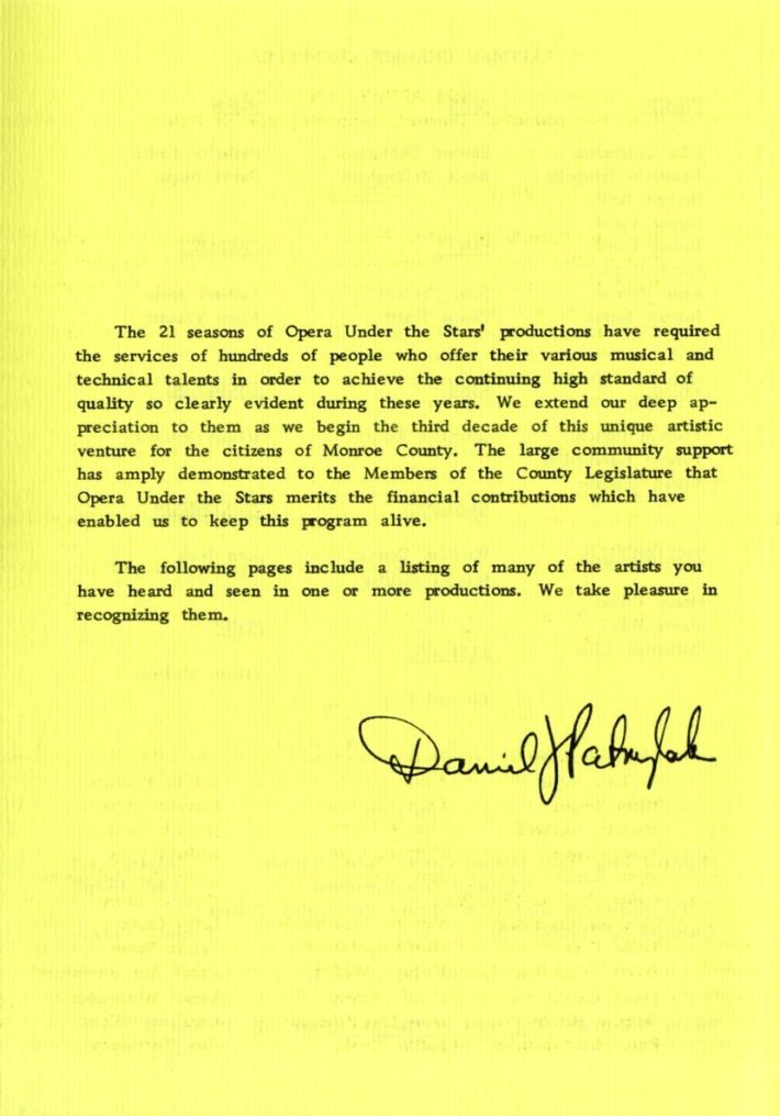 In 1976 the Eastman School’s Robert Freeman, Director, announced that Eastman would discontinue its financial support of Opera under the Stars, but would continue to provide logistical support in the way of rehearsal space, orchestral parts, and flats. Ultimately, sufficient support was not forthcoming from other sources, and the initiative was discontinued after the 1976 season. Michael Walsh, music critic for the Rochester Democrat & Chronicle, cited several concerns in a June, 1976 article, pointing out the challenging parking situation, the traffic noise emanating from nearby South Avenue, and an inadequate amplification infra-structure, together with other, more subjective concerns. Mr. Walsh cited a decline in the number of productions (a glance at the complete roster of productions will indicate that he had been mistaken) together with a steady fall-back on musical theater repertory instead of opera (what Mr. Walsh might not have known was that musical theater had been on the Opera under the Stars agenda back in 1953), substantial cuts made in the repertory for the sake of truncating durations of performances.[2] (The latter point is impossible to verify at this later date.) Notwithstanding the financial realities and whatever other prevailing concerns by 1976, the record speaks for itself: a steady, successful run of productions since 1953 that had brought the Eastman School closer to the citizens of Rochester. Two hundred and fifty-thousand-plus opera-goers in 24 seasons is a thumping statistic; after all, the public never turns out an opportunity to enjoy good music outdoors in summer. From time to time a performance might be rained out, but the team always planned for this; every year’s schedule of performances included back-up “in case of rain” dates. Overall, Opera under the Stars had been a winning formula. Bravo and thank you, Professor Leonard Treash!