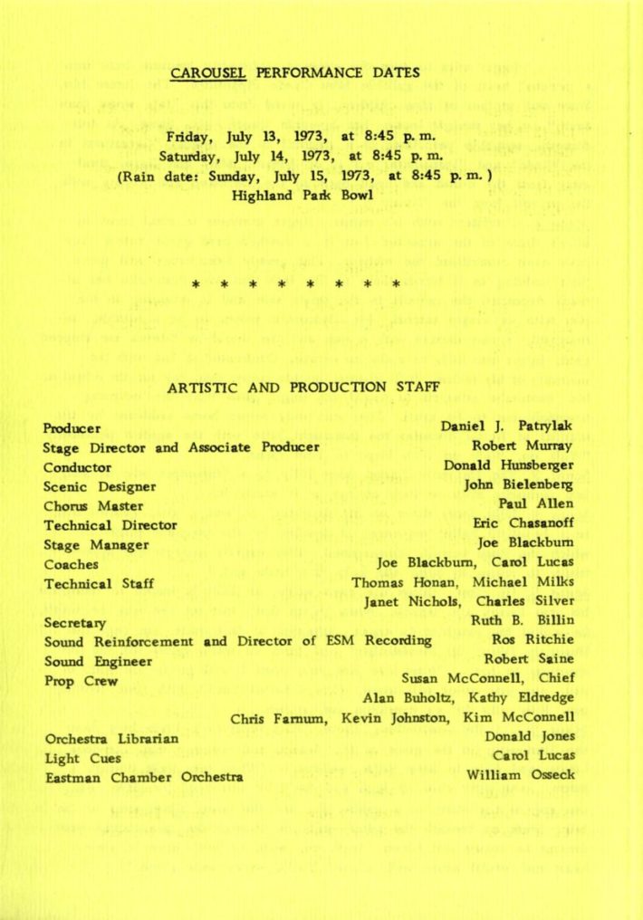 And so it was that forty-nine years ago this week, a production of the musical Carousel was staged in Highland Park (two performances) to favorable local reviews. The production was the first in the 21st season of Opera under the Stars. The printed program is displayed here, and the Eastman School of Music is, figuratively speaking, imprinted all over the program. The producer, Daniel Patrylak, was an Eastman School administrator (served in that capacity 1967-75); the conductor, Donald Hunsberger (served 1964-2002) was an Eastman faculty member; and a second faculty member, John Maloy (served 1966-2005), was in the cast. Both the sound reinforcement head and the orchestra librarian, Ros Ritchie and Donald Jones, were Eastman School personnel. Whereas the orchestral musicians for Opera under the Stars productions were normally supplied by the Rochester Federation of Musicians, for this production the supply orchestra came from Eastman, that being the Eastman Chamber Orchestra, comprised primarily of Eastman School faculty members joined by some students. The cast numbered included seven Eastman School alumni and one enrolled student; they were Joyce Hall, ’58; Cecile Saine, ’72; William MacFarland, ’72; Robert Zajkowski, ’59; James Courtney, ’73 (and a member of the Metropolitan Opera Company since 1979); Christina McCarthy, ’73; and William Briggs, ’58; and John Oliver, ’75 had just completed his sophomore year. Still more Eastman students were represented in the chorus. The complete roster of Opera under the Stars artists and chorus members to date (1953-73) was printed in the program, together with the names of dancers and of children’s chorus members. Many of the children’s chorus members were children of Eastman School faculty members and staff members. Look closely, and you’ll also see the names of two Fleming sisters, each of whom would later earn a master’s degree at Eastman.