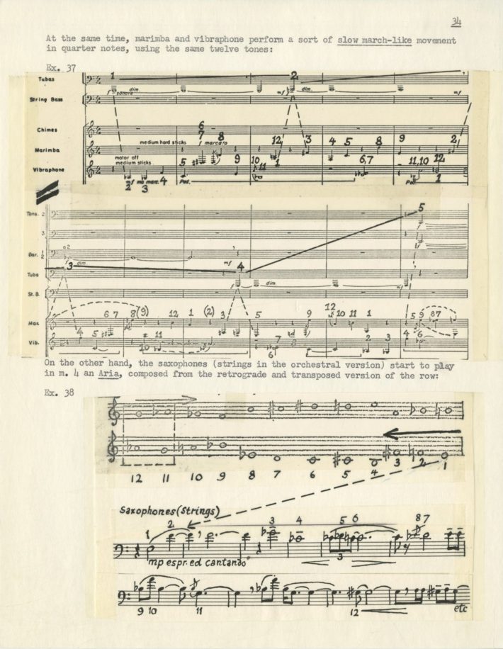 Another page from this set of sketches is labeled “Aria”—the title of the second movement of Music for Prague 1968. Here we see the second primary tone row used in the piece (Row B) written out across the topmost staves, followed by several musical ideas built from fragments of the row. The heavily marked and revised sketches in this folio bear some structural similarities to the opening of the final “Aria”: the pitches for the harp accompaniment in the sketch were repurposed for vibraphone and marimba, and the solo (marked “con sord.” in the sketch) became the tutti saxophone melody.