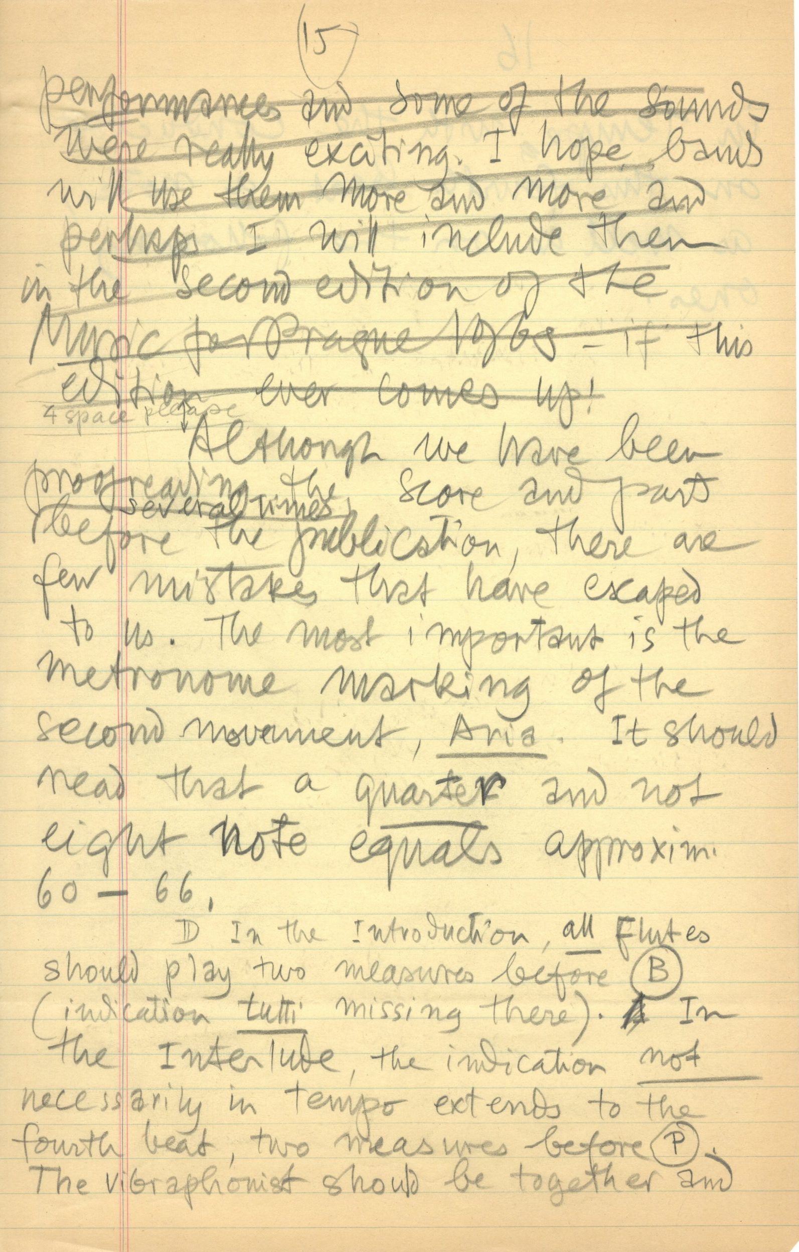 In 1971, about two years after the work’s premiere, Karel Husa was invited to give a brief presentation on Music for Prague 1968 at the College Band Directors National Association national conference hosted that year by the University of Texas. A copy of Husa’s handwritten draft of his presentation is preserved in the Archive, and his final remarks were later published in The College and University Band: An Anthology of Papers from the Conferences of the College Band Directors National Association, 1941-1975.[3]