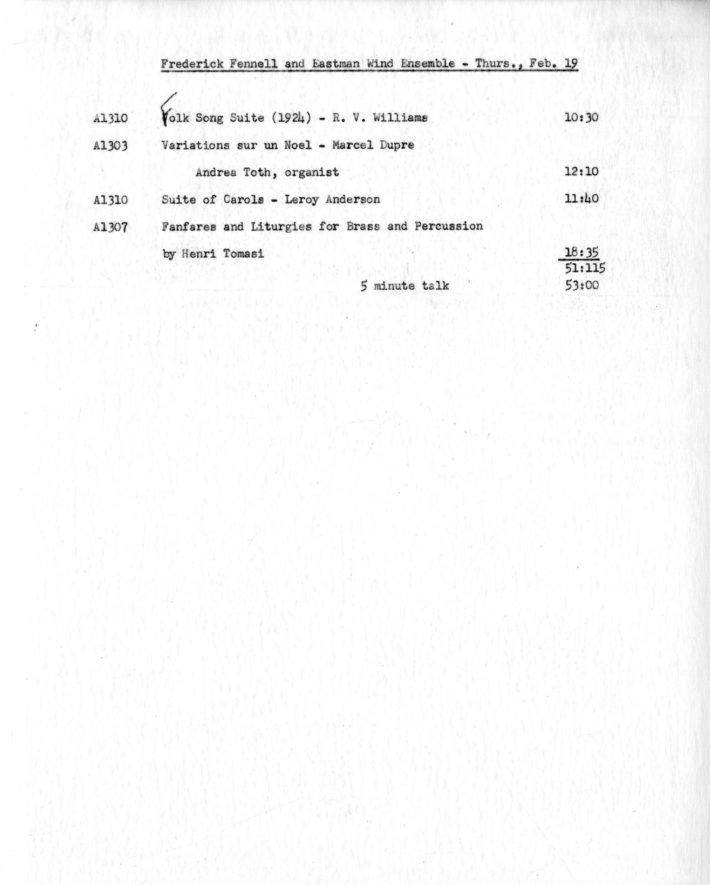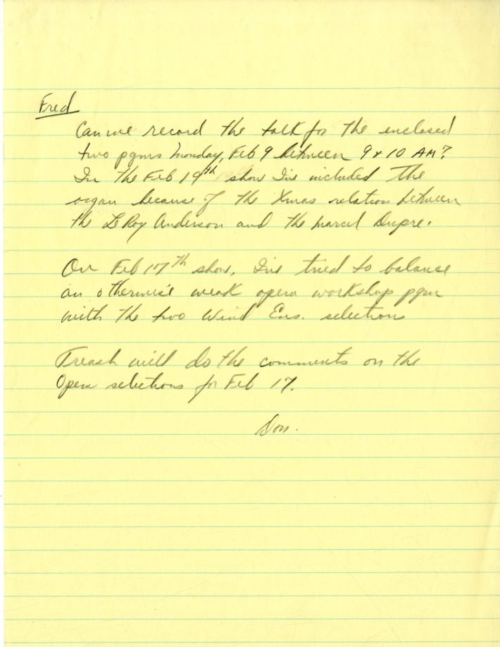► Among Frederick Fennell’s papers are some samples of “Evening at Eastman” programs. The two programs shown here are accompanied by a note to Dr. Fennell from Don Lyon, Director of Television and Radio for the University of Rochester, who bore ultimate responsibility for the programming. Frederick Fennell Papers, accession no. 993.9.