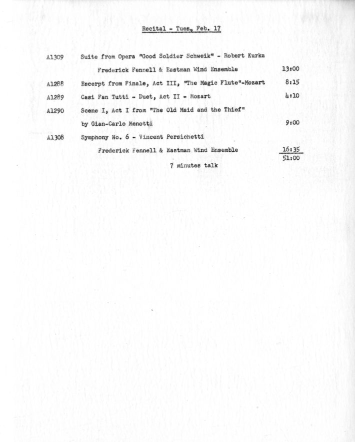 [5] Frederick Fennell originated the Eastman Chamber Orchestra and served as its music director each summer for nine seasons (1954 through 1962). The ECO concert of July 26th, 1962 was the occasion of Maestro Fennell’s last bow at Eastman before departing for his new post at the Minneapolis. Symphony Orchestra.