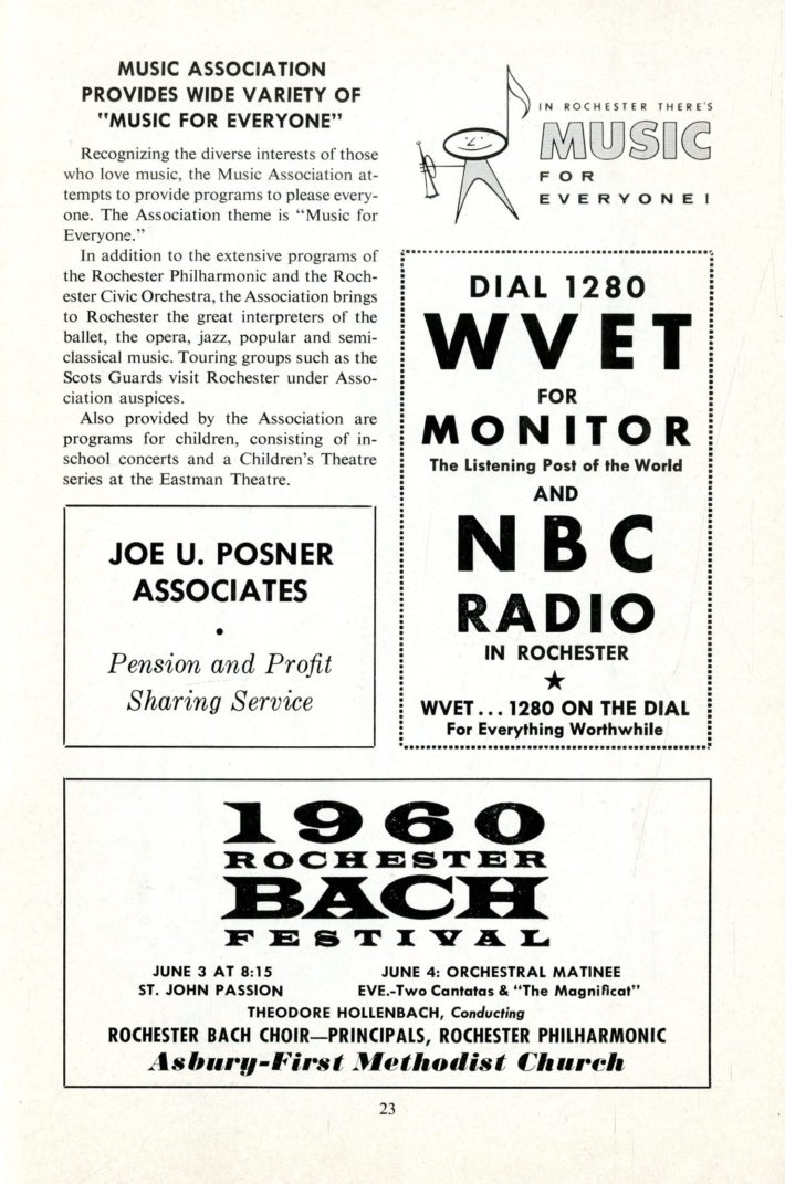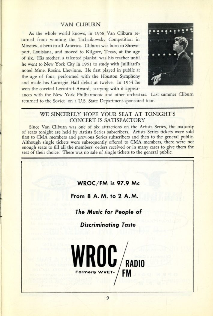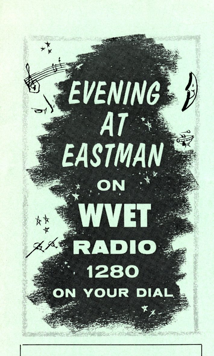 ►Printed advertisements for WVET and WROC, two of Rochester’s radio stations, which appeared in local concert programs. Both of these stations bore responsibility for transmission of “Evening at Eastman” between 1958 and 1962. In the 1961-62 season the Veterans Broadcasting Company purchased WROC-TV/FM. Besides the migration from callsign WVET to WROC, “Evening at Eastman” underwent another major change during its run, which was the change in time slot from 9pm/10pm to 7pm/8pm.