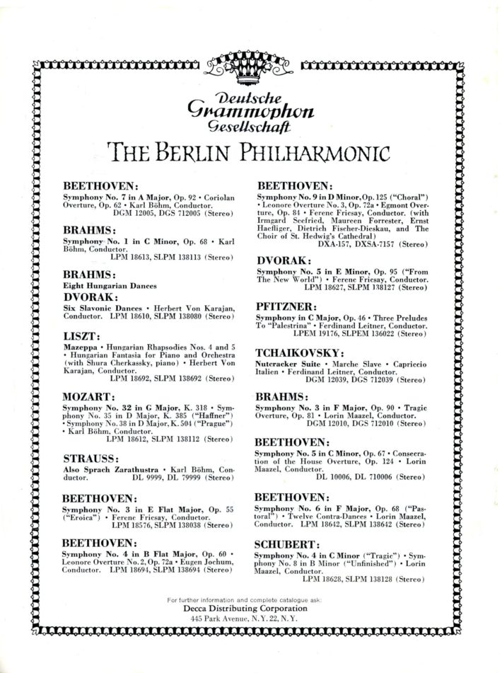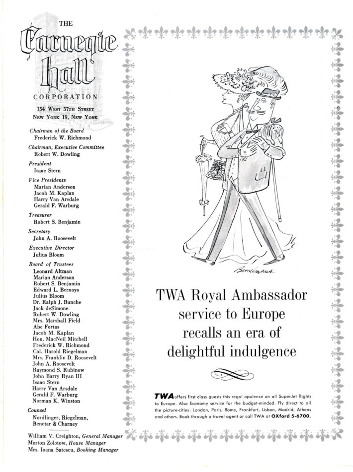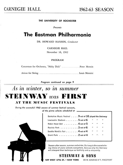 In the years since 1962, the Eastman Philharmonia has been back to New York City on several occasions, including three more engagements at Carnegie Hall (1972, 1983, 1990), as well as concerts at Alice Tully Hall.  The 1962 concert may be regarded as special in more than one respect—not only for having been the orchestra’s first time in that renowned venue, but also for having confirmed the orchestra’s newly-won status as an ensemble of world-class stature.
