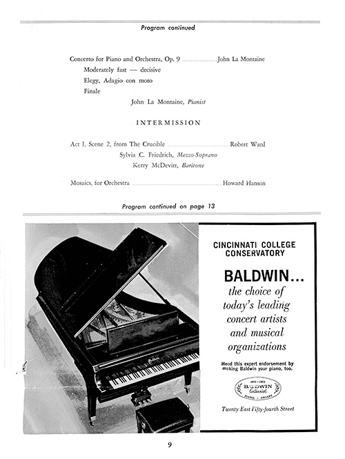 For the Carnegie Hall concert Hanson had chosen music almost entirely by Eastman School alumni composers. Two of the composers—Robert Ward and John La Montaine—were represented by works which had been recognized with the Pulitzer Prize. The most substantive work on the program, from the standpoint of duration, was Mr. La Montaine’s  Concerto for Piano and Orchestra, opus 9. The work had been commissioned by the American Music Center for the National Symphony Orchestra under a grant from the Ford Foundation.  This Concerto ultimately proved to be the composer’s first of four concertos for piano and orchestra. Mr. La Montaine was a gifted pianist in his own right, and in 1965 he would return to Eastman as soloist in this Concerto at the Eastman School’s annual Festival of American Music.  When Mr. La Montaine had won the Pulitzer Prize for the Concerto in 1959, he had been the Eastman School’s second composer-graduate to have been so honored.  For the record, the Eastman School’s Pulitzer Prize-winning composer-graduates have been the following: